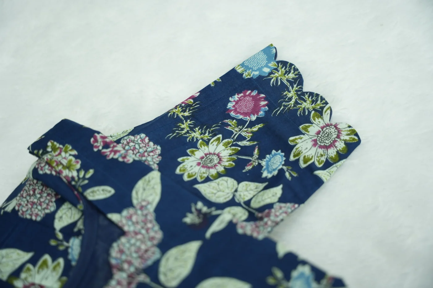 Aruvi Maxi Embrace the beauty of nature and effortless elegance with the Aruvi Maxi, a stunning ensemble that masterfully showcases a rich botanical aesthetic. This outfit features a deep navy blue body adorned with an intricate, vibrant floral print of stylized sunflowers and blossoms that add a regal, nature-inspired touch to the silhouette. The design is beautifully defined by a unique scalloped-edge neckline and matching sleeve borders, providing a sharp, artistic contrast to the flowing fabric. Crafted from premium-quality, breathable fabric, this set is designed for the woman who loves to make a statement while enjoying all-day comfort.