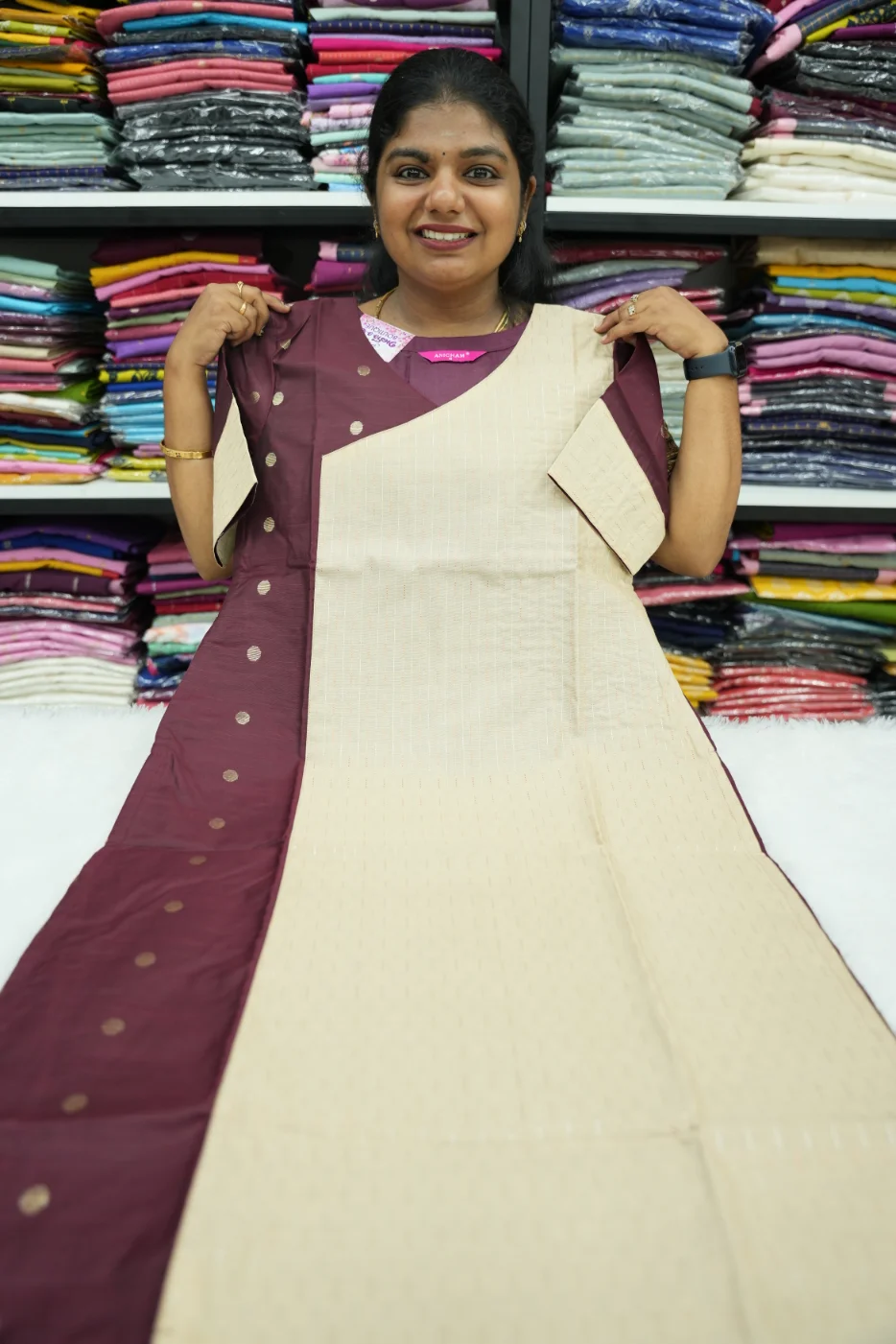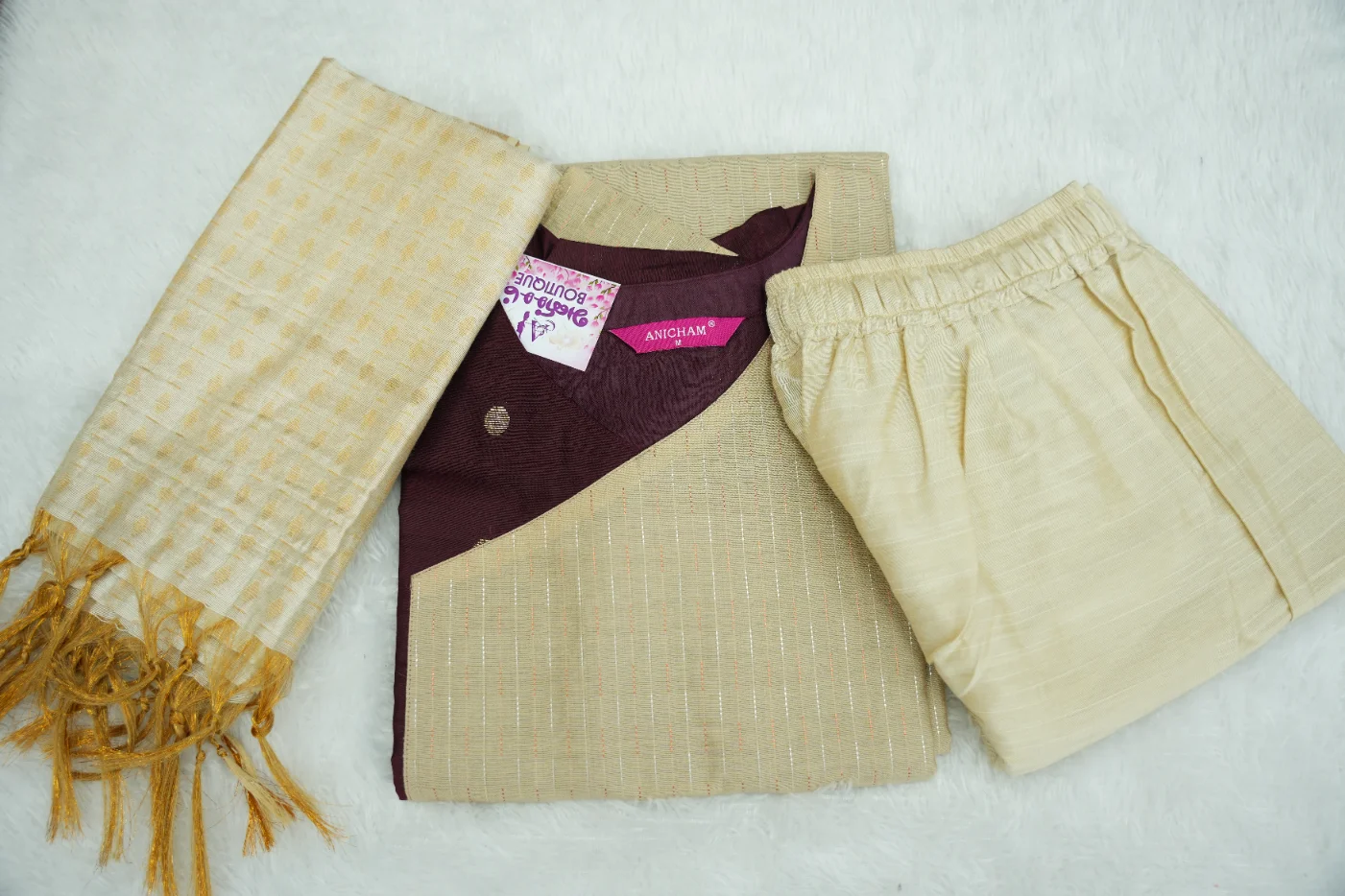 Biscuit With Maroon Exude earthy charm and refined elegance with the Biscuit With Maroon set, a stunning ensemble that masterfully plays with sophisticated neutral tones and bold accents. This outfit features a warm biscuit-colored body adorned with delicate, vertical golden stripes that add a regal, elongated touch to the traditional silhouette. The design is beautifully defined by a deep maroon yoke, featuring intricate golden micro-woven motifs that provide a sharp, artistic contrast. Crafted from premium-quality, breathable textured fabric, this set is designed for the woman who loves to make a statement while enjoying all-day comfort.