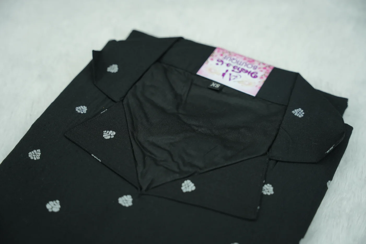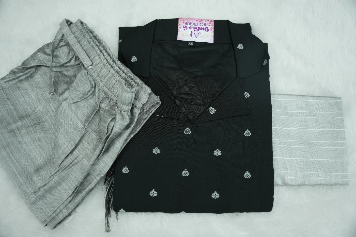 Black Top Exude bold confidence and modern ethnic charm with the Black Top set, a stunning ensemble that masterfully plays with high-contrast detailing. This outfit features a deep charcoal-black body adorned with prominent silver-white leaf-shaped butta motifs that add a regal, traditional touch to the contemporary silhouette. The design is beautifully defined by a sophisticated collar and a sharp V-cut neckline, providing a refined, artistic finish. Crafted from premium-quality, breathable textured fabric, this set is designed for the woman who loves to make a statement while enjoying all-day comfort.