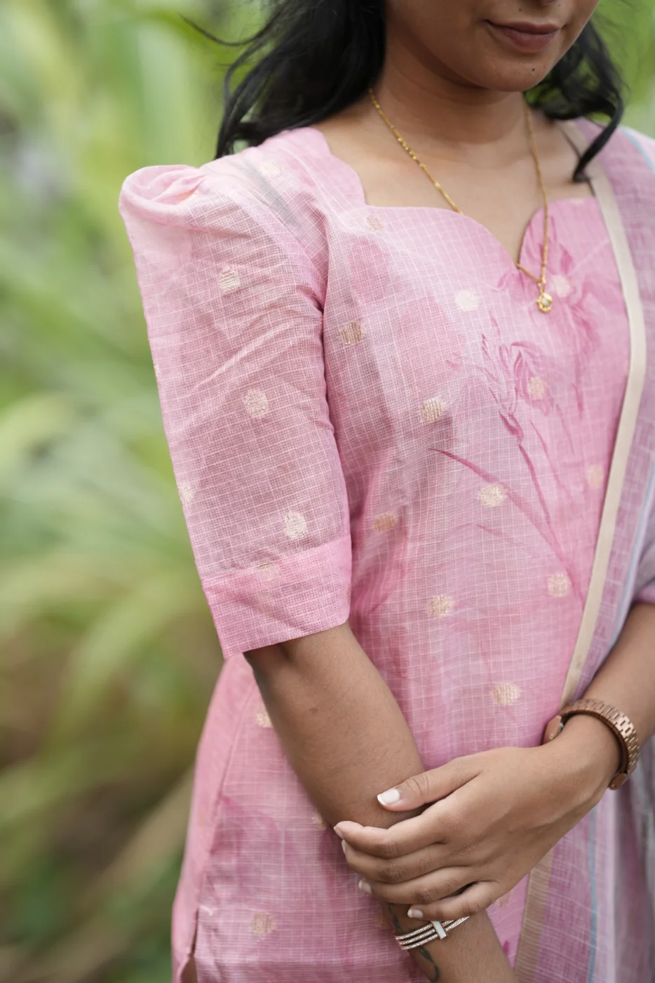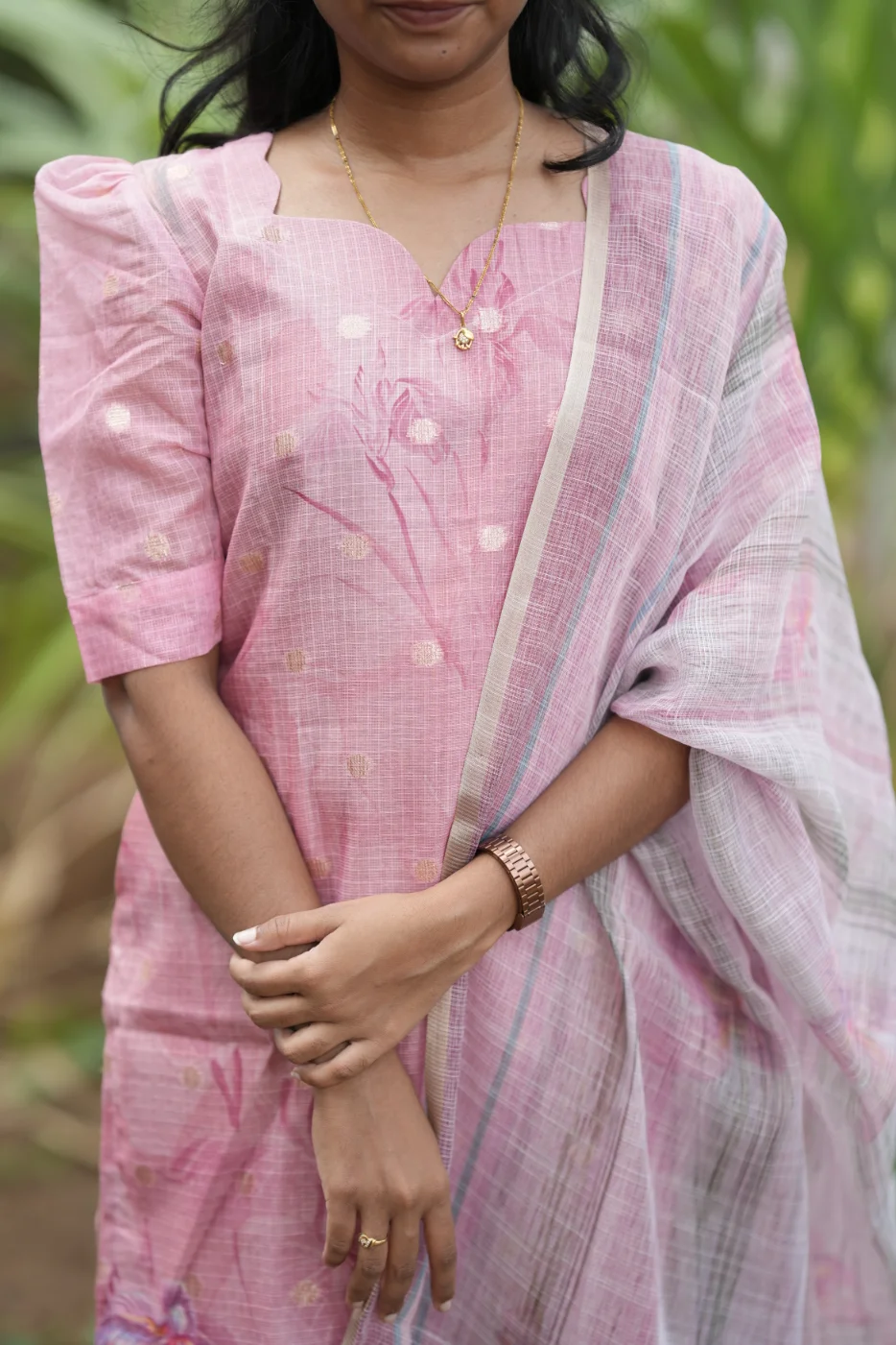 Radiate gentle elegance with the Blossom set, a masterpiece of subtle charm and grace. This ensemble features a delicate pink hue adorned with shimmering golden polka motifs that catch the light beautifully. The premium-quality, textured fabric offers a luxurious feel against the skin while ensuring a flattering silhouette. Paired with a stunning floral-print dupatta featuring elegant striped borders, this set is ideal for festive celebrations, weddings, or special family gatherings where you want to shine with understated sophistication.
