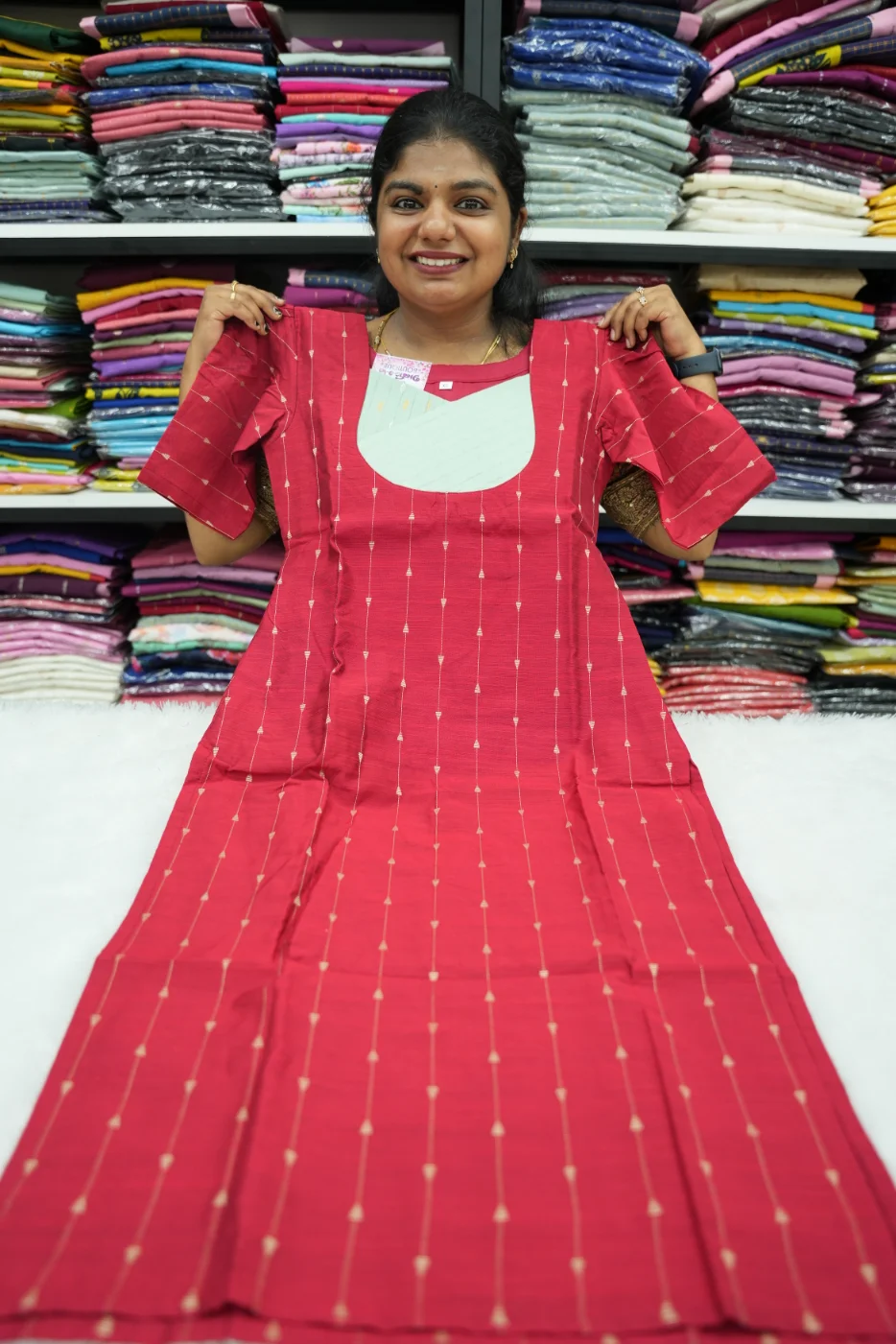 Cherry Pleated Arrow Exude timeless elegance and bold sophistication with the Cherry Pleated Arrow set, a stunning ensemble that masterfully plays with rich textures and refreshing color contrasts. This outfit features a deep cherry-red body adorned with delicate, vertical golden "arrow" motifs that add a regal, elongated touch to the traditional silhouette. The design is beautifully defined by a serene seafoam green yoke featuring a contemporary pleated, overlapping V-cut design that provides a sharp, artistic contrast. Crafted from premium-quality, breathable textured fabric, this set is designed for the woman who loves to make a statement while enjoying all-day comfort.