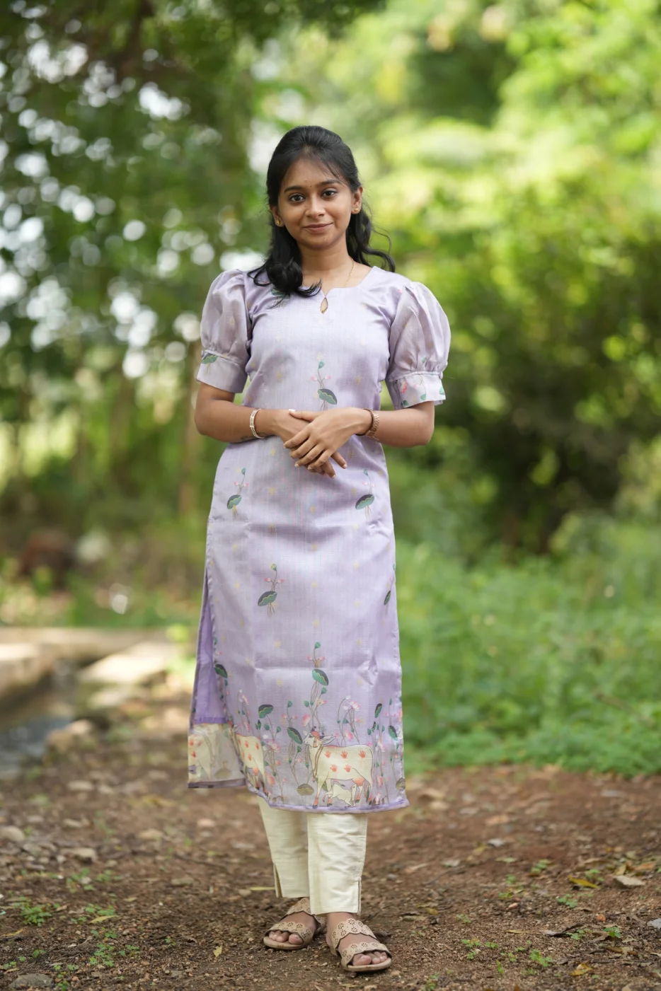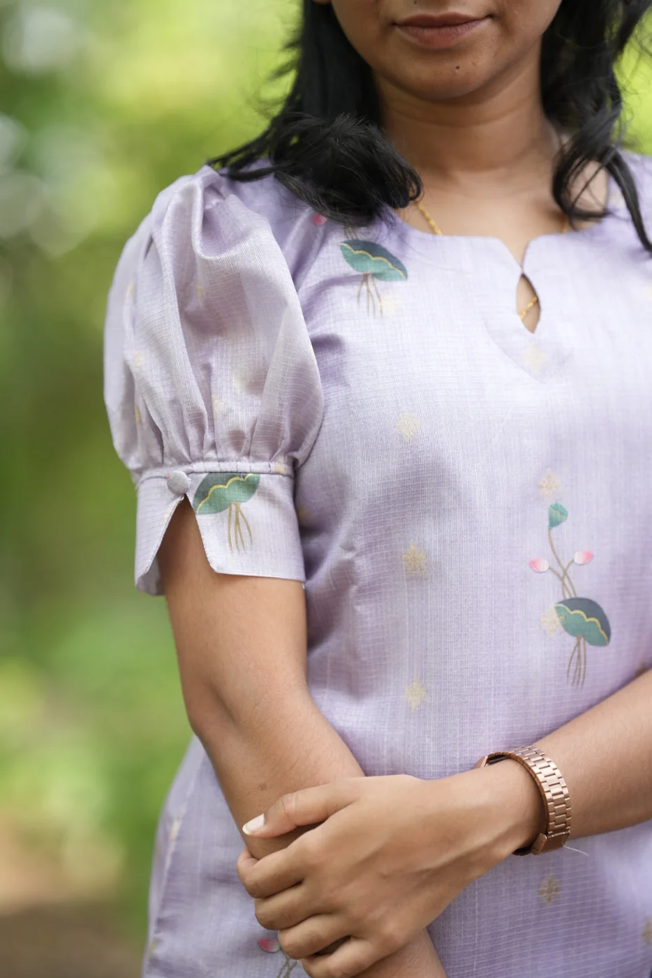 Step into a world of whimsical elegance with the Daisy set, a beautiful blend of soft pastels and artistic storytelling. The gentle lilac hue is adorned with delicate lotus motifs and a stunning illustrative border, creating a look that is both serene and captivating. Crafted from premium-quality, breathable fabric, this outfit offers a soft, airy feel and a perfect fit for all-day wear. Ideal for garden parties, festive brunches, or peaceful daytime celebrations, the Daisy set brings a touch of nature-inspired beauty to your wardrobe.