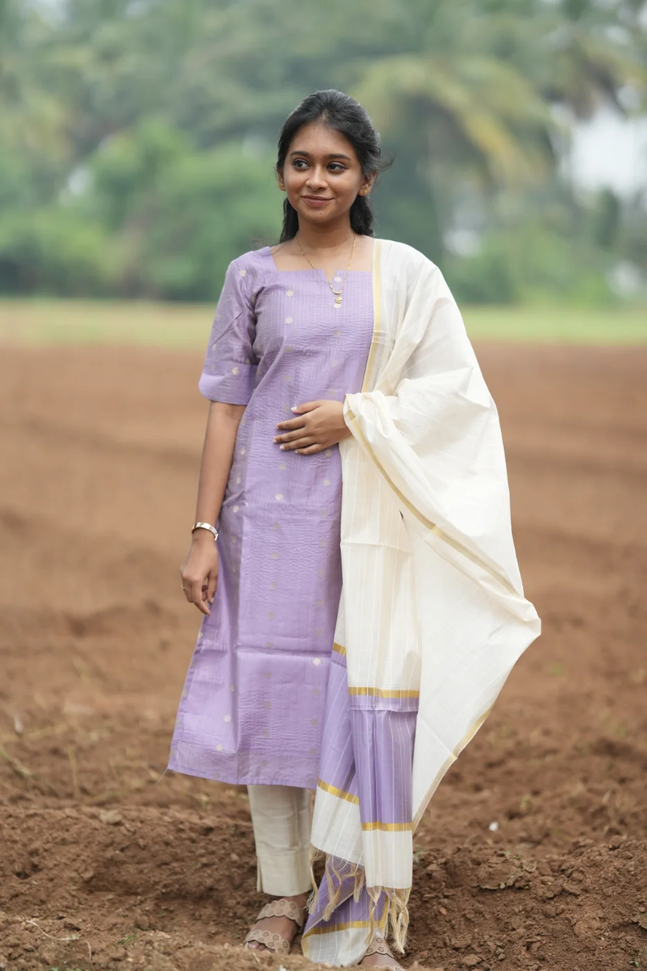Exude a sense of calm sophistication with the Lilac Stripes set. The gentle lavender hue is beautifully accented by fine golden vertical stripes and shimmering polka motifs, creating a look that is both polished and serene. Crafted from premium-quality, textured fabric, this ensemble offers a soft touch and a breathable fit for all-day comfort. Ideal for daytime festivities, formal gatherings, or elegant social events, this dress combines modern detailing with a graceful, timeless charm effortlessly.