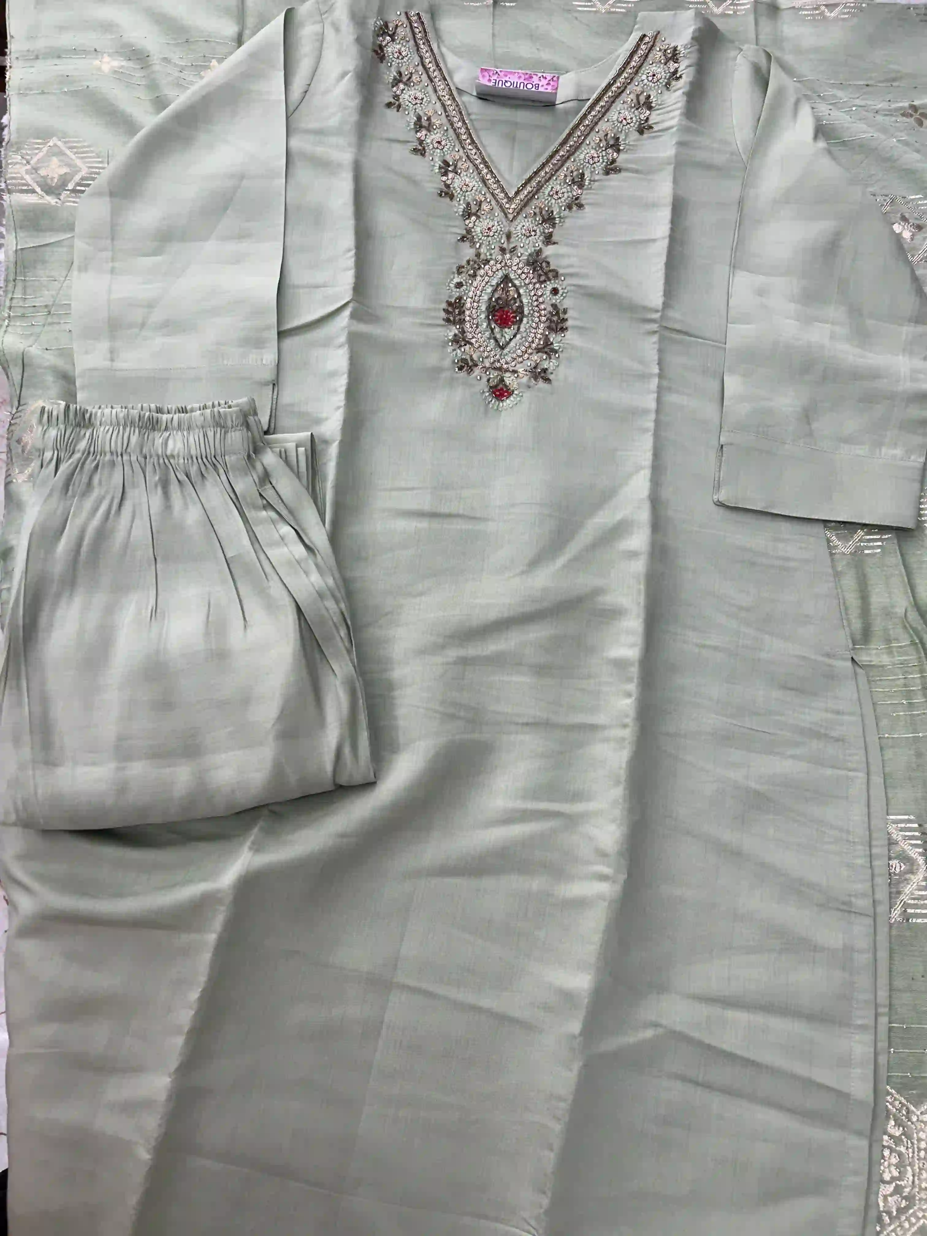 Elegant, graceful, and beautifully detailed, this Ma Set is designed to bring a touch of festive sophistication to your wardrobe. The soft pastel green tone offers a soothing and refined base, while the intricate neckline embroidery adds a luxurious highlight, making it perfect for special occasions.