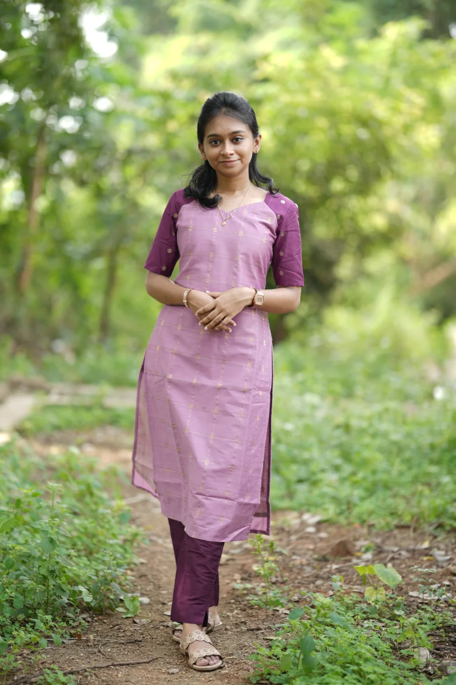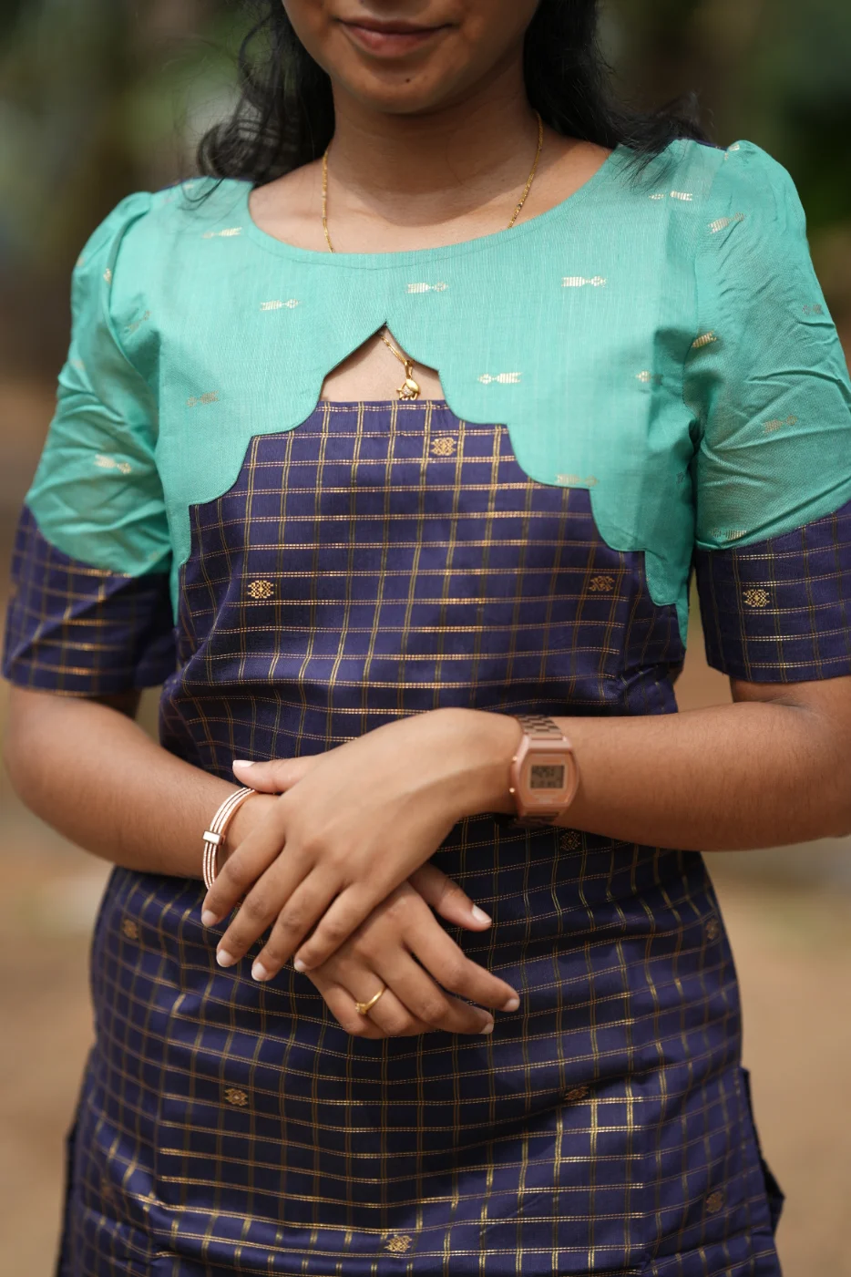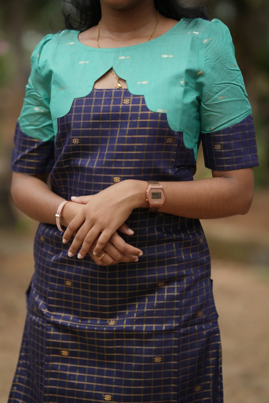 Command attention with the striking and sophisticated Navy Blue With Rexona set. This ensemble features a deep navy blue body detailed with classic golden grid patterns, creating a regal and structured look. The vibrant sea-foam green (Rexona) yoke and sleeve detailing provide a refreshing pop of color, while the unique scalloped neckline adds a touch of modern artistry. Crafted from premium-quality, textured fabric, this outfit offers a refined fit that is perfect for festive celebrations, formal gatherings, or elegant evening wear.