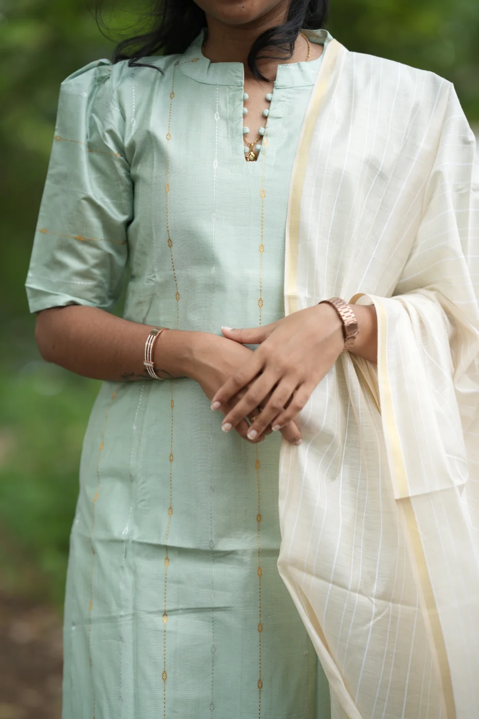 Embrace a look of serene sophistication with the Pistachio set, a beautiful blend of soft, refreshing tones and understated elegance. The gentle light green body features a subtle, shimmering texture that catches the light beautifully, creating a polished and graceful appearance. Complemented by a flowing cream dupatta adorned with oversized peach and green floral prints, this ensemble is designed for the modern woman who values both comfort and timeless style. Ideal for daytime festivities, garden parties, or elegant social gatherings, the Pistachio set offers a breezy, breathable fit that keeps you feeling as fresh as you look.