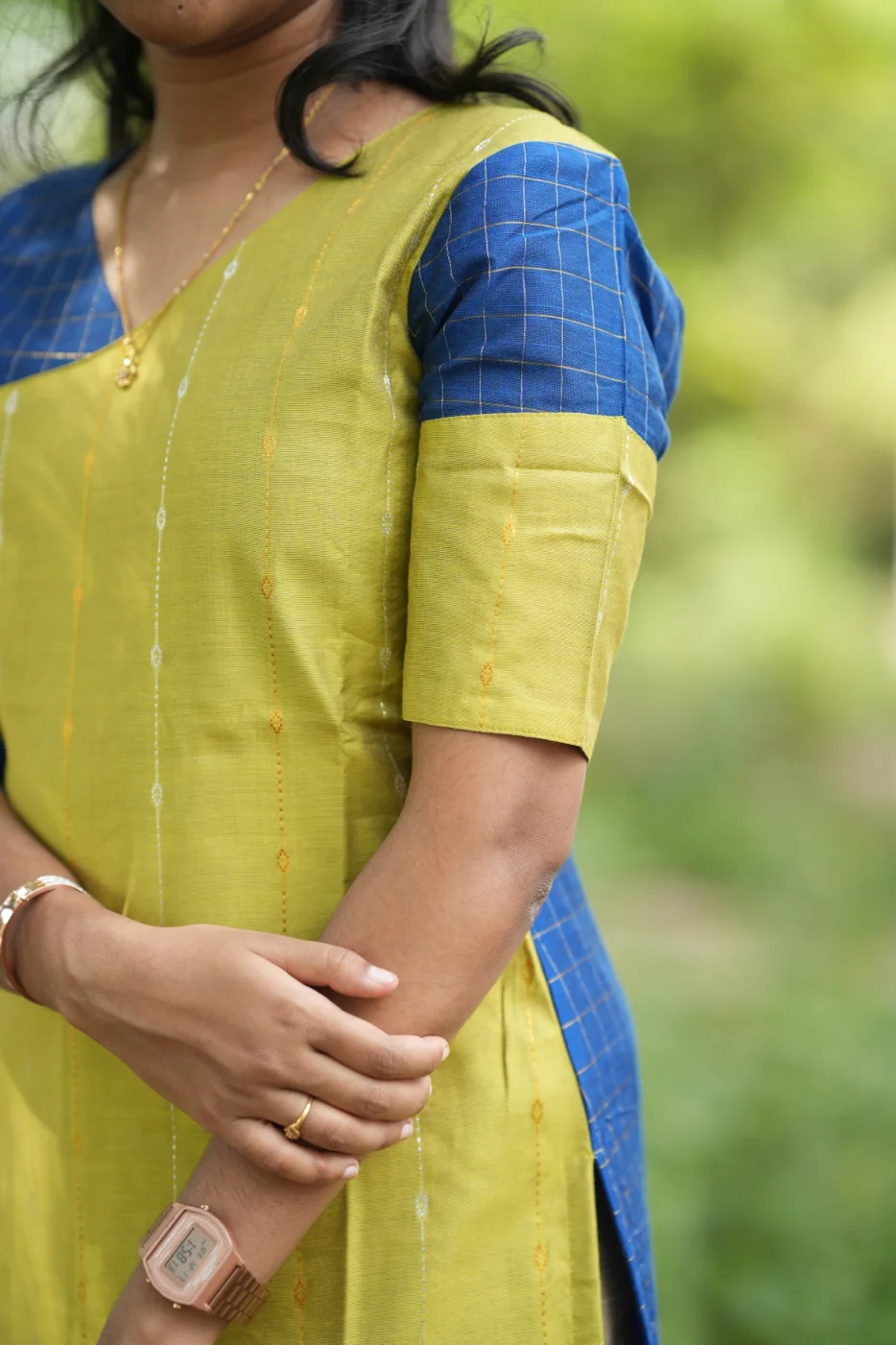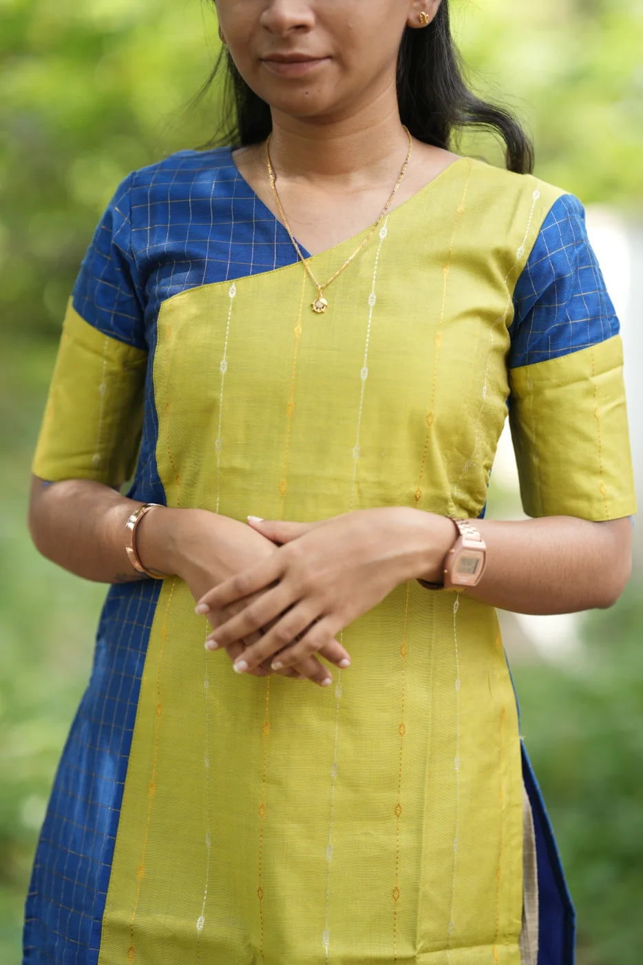 Experience the perfect harmony of bold contrasts and traditional textures with the Saaral set. This ensemble features a striking lime-yellow body detailed with delicate vertical shimmer lines and micro-woven patterns, creating a bright and energetic presence. The vibrant yellow is beautifully framed by deep navy blue side panels and sleeves adorned with classic golden grid checks. Crafted from premium-quality, breathable fabric, this outfit provides a structured silhouette while maintaining a lightweight feel for all-day comfort. Ideal for festive celebrations, cultural events, or elegant social gatherings, the Saaral set is a masterclass in modern color-blocking and heritage charm.