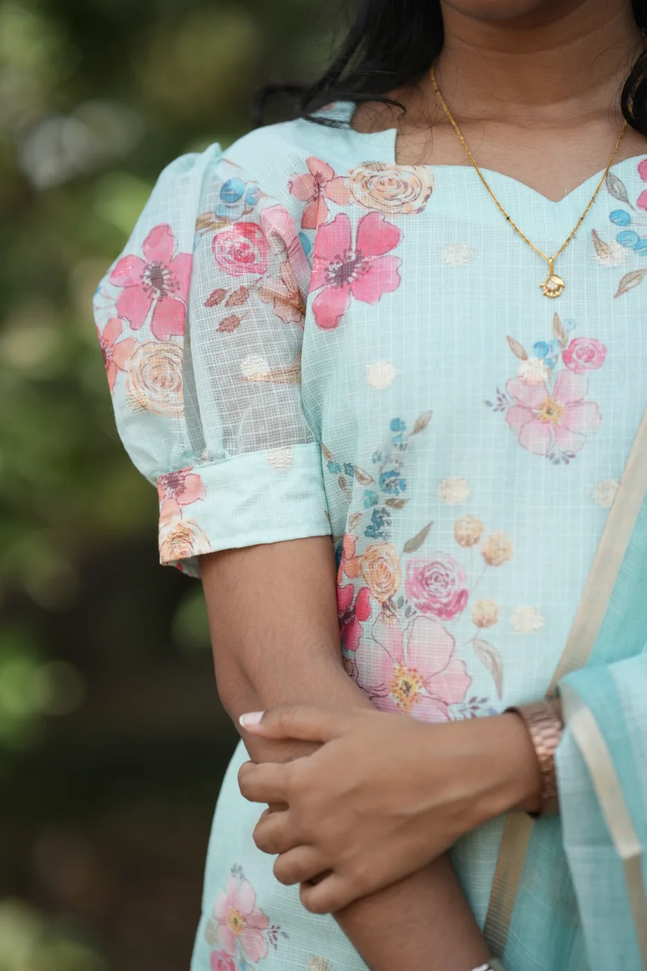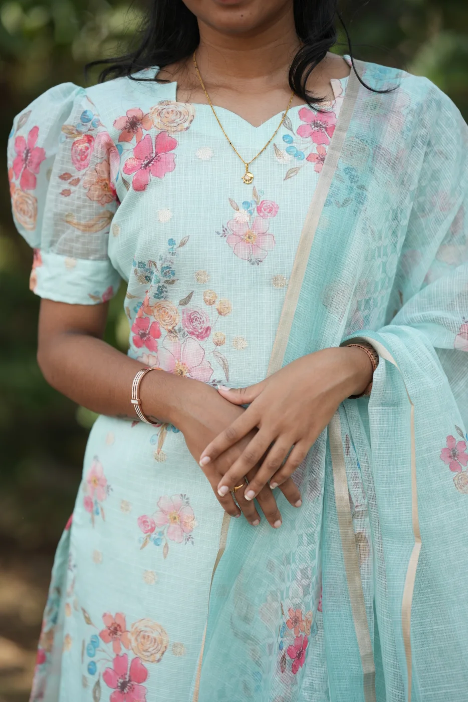 Radiate charm and feminine grace with the Sembaruthi set, a beautiful ensemble designed for moments of joy. This set features a soft, pastel pink body detailed with delicate golden vertical micro-motifs and fine horizontal shimmer lines that catch the light with every movement. Crafted from premium-quality, breathable fabric, it offers a lightweight and airy feel, making it perfect for long hours of celebration. Paired with a classic cream dupatta featuring golden horizontal borders, the Sembaruthi set is an ideal choice for daytime festivities, social gatherings, or elegant casual wear.