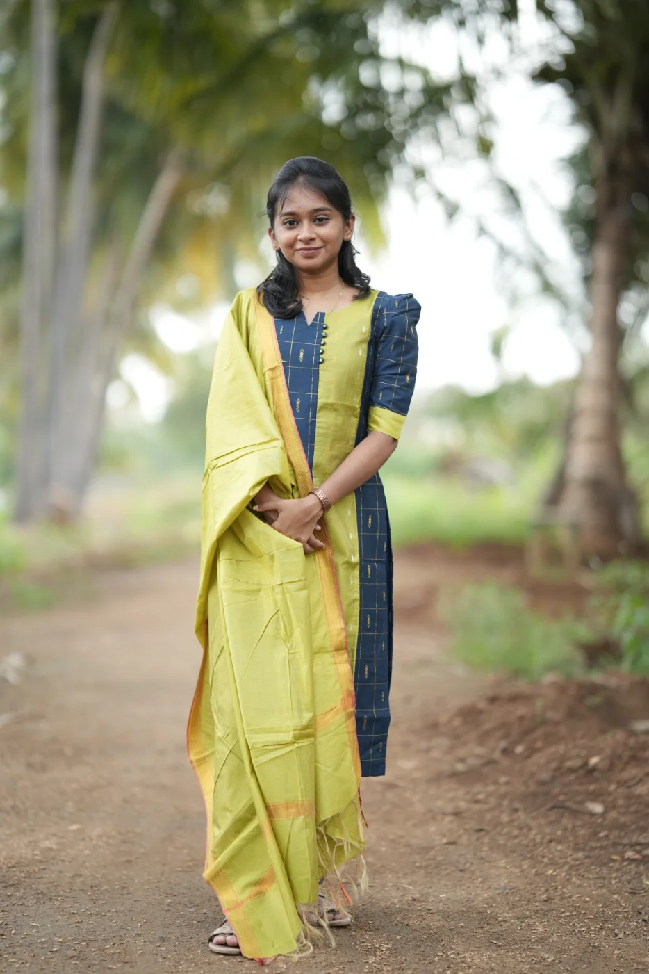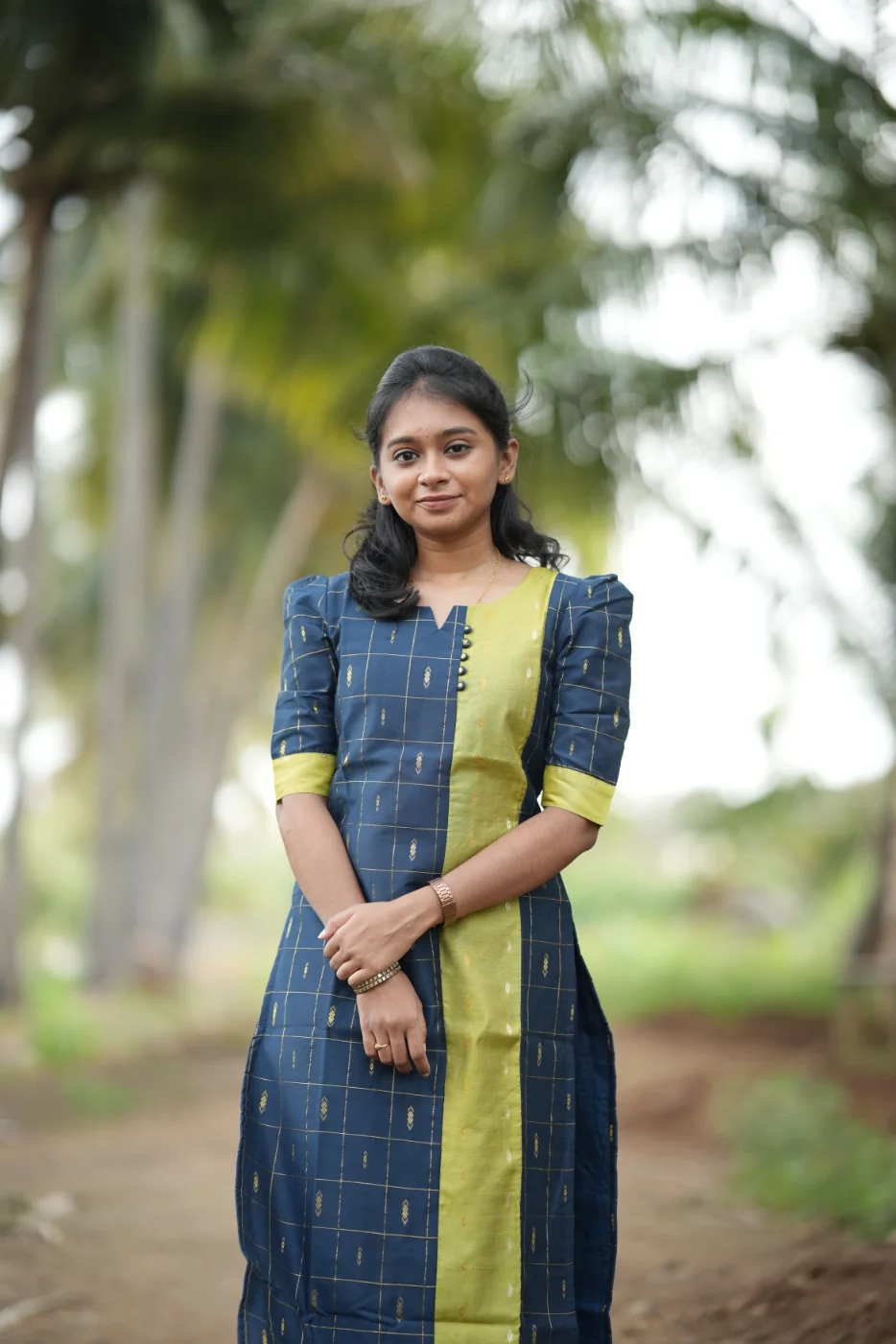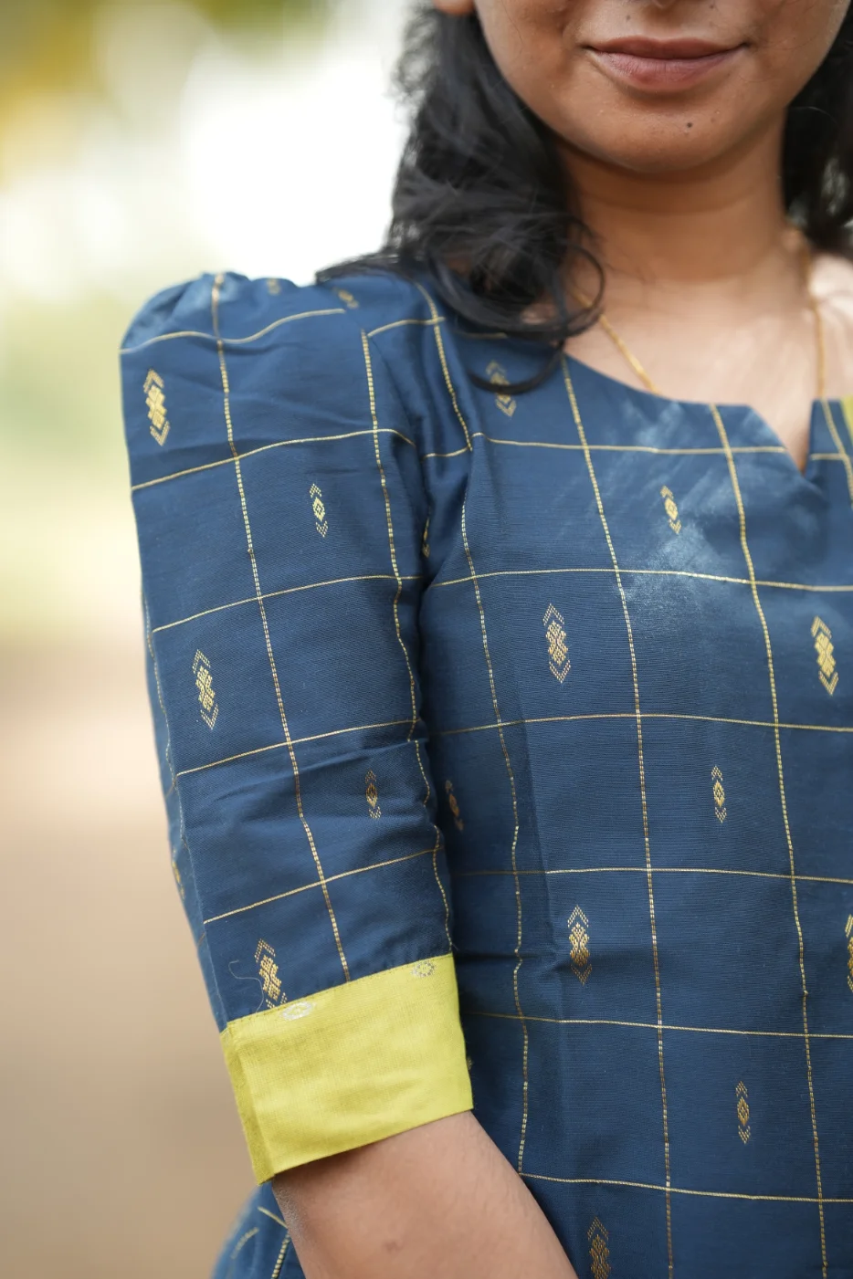 Command a regal presence with the Sindhu set, a masterclass in sophisticated color-blocking and structured elegance. This ensemble features a deep navy blue body adorned with a classic golden grid pattern and shimmering diamond micro-motifs. The striking lime-green center panel and sleeve cuffs provide a vibrant contrast, while the unique neckline—accented with delicate fabric buttons—adds a contemporary touch to the traditional silhouette. Crafted from premium-quality, breathable fabric with a rich texture, the Sindhu set is designed to offer a sharp, tailored fit that ensures you stand out at any festive occasion or high-profile social gathering.