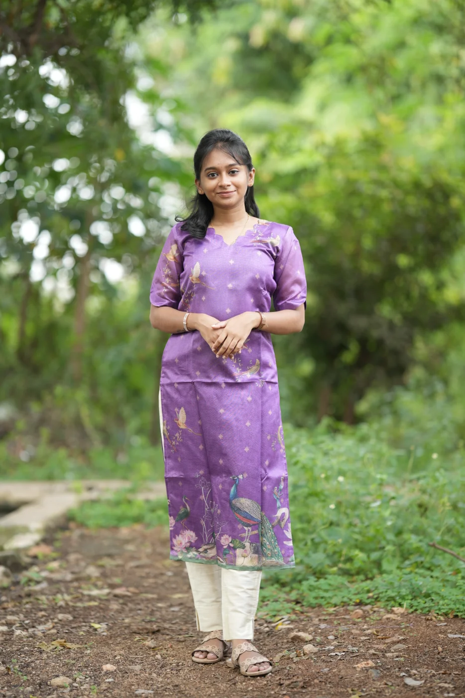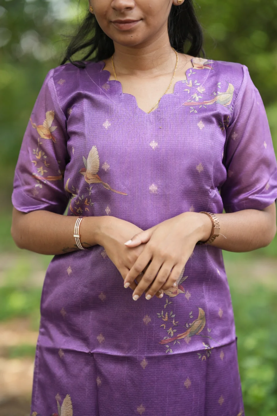 Experience the perfect harmony of nature and elegance with the Violet Garden set. This captivating ensemble features a rich violet body detailed with delicate shimmering micro-motifs. The design is artfully elevated by an exquisite botanical print at the hemline, featuring vibrant peacocks and lush floral landscapes. Crafted from premium-quality, breathable textured fabric, this outfit offers a soft, structured silhouette that ensures all-day comfort. The contemporary scalloped neckline and unique slit sleeves add a modern touch to its traditional grace, making it an ideal choice for festive celebrations, cultural ceremonies, or elegant daytime events.
