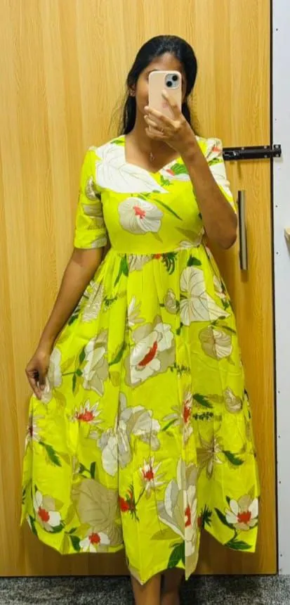 The dress is styled with a neat and flattering neckline that enhances its minimal and elegant appeal. The bodice gently flows into a flared silhouette, creating a graceful drape that adds both comfort and style. The evenly spaced floral prints give the dress a balanced and pleasing look.