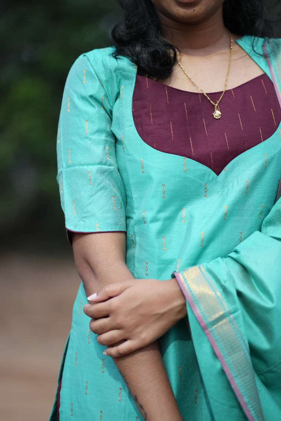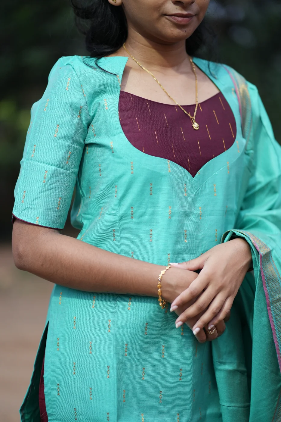 Upgrade your everyday style with this stunning Mint Green Kurthi featuring a bold Maroon contrast yoke and delicate golden woven motifs.