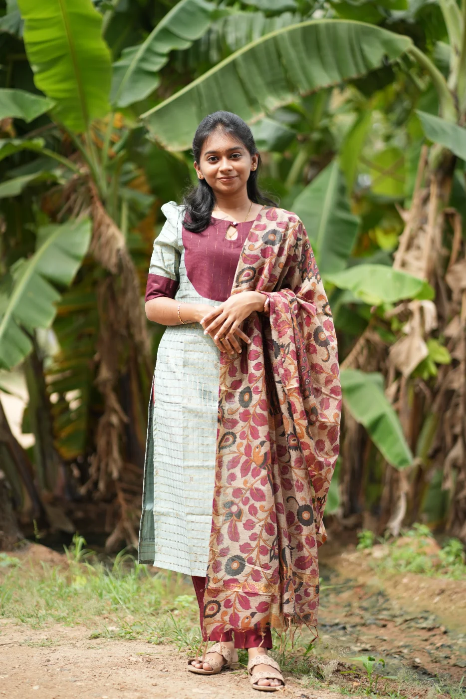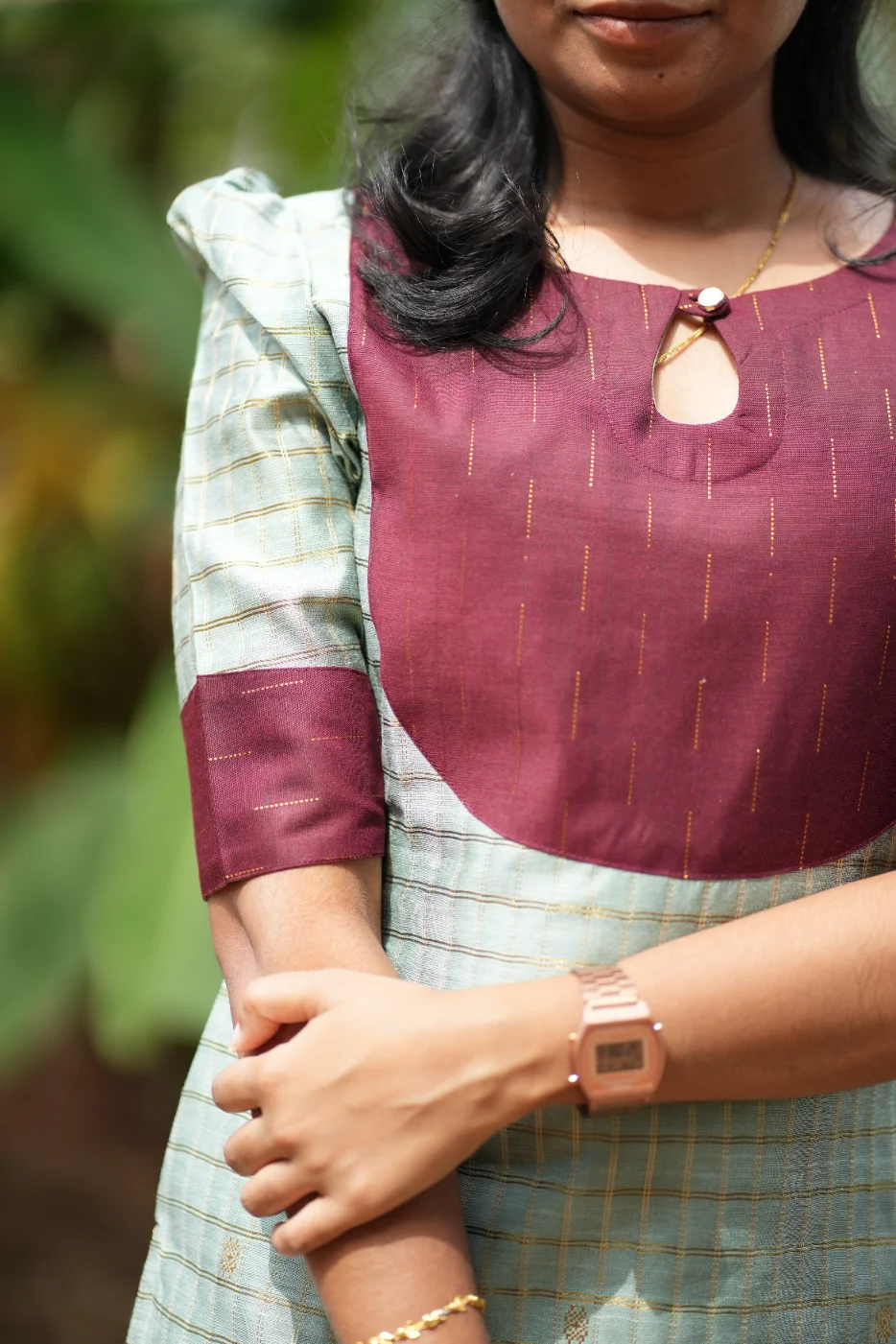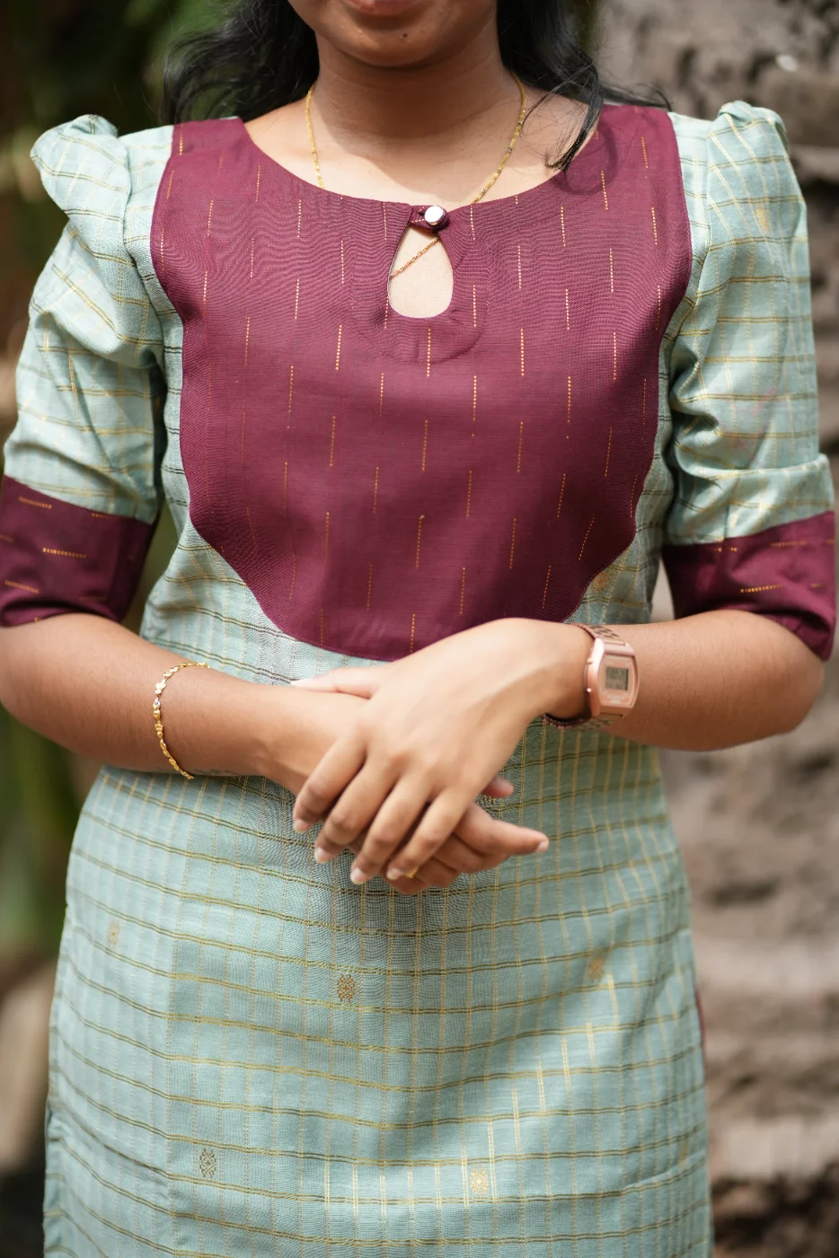 Discover the elegance of contrast with our Golden Pista ensemble. Featuring a dusty green body with self-woven gold lines, this kurti is highlighted by a bold maroon yoke and matching structured pants.
