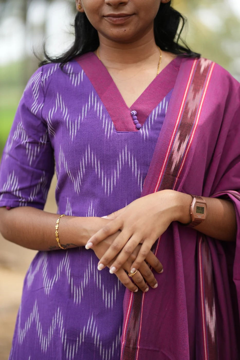 Description: Immerse yourself in the timeless charm of traditional Indian weaves with our Ikkat Violet Set. This vibrant three-piece ensemble features a stunning violet kurti adorned with classic white geometric Ikat patterns, offering a look that is both heritage-inspired and contemporary.