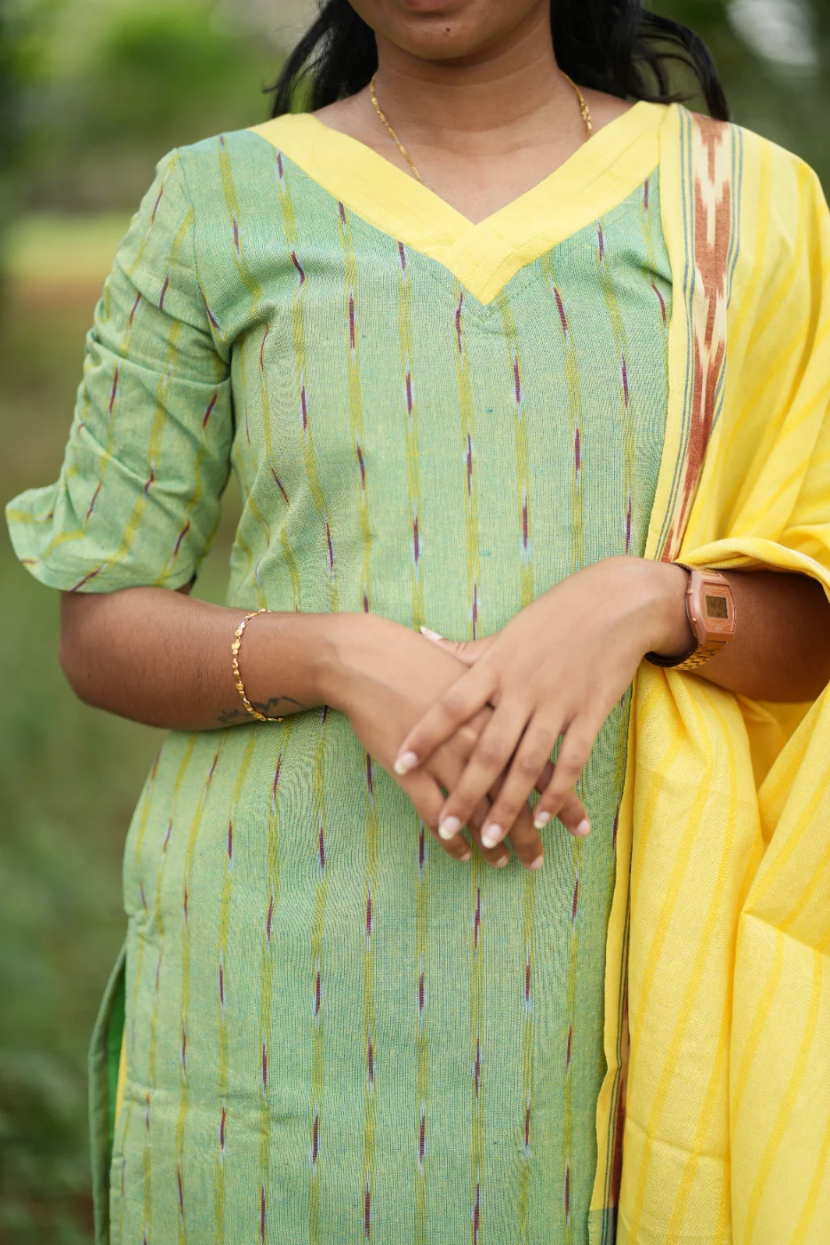 Product Description: Refresh your ethnic collection with the vibrant and breezy Ikkat L Green Set. This charming three-piece ensemble features a soothing light green kurti adorned with vertical Ikat-inspired motifs, adding a touch of traditional artistry to a contemporary silhouette.