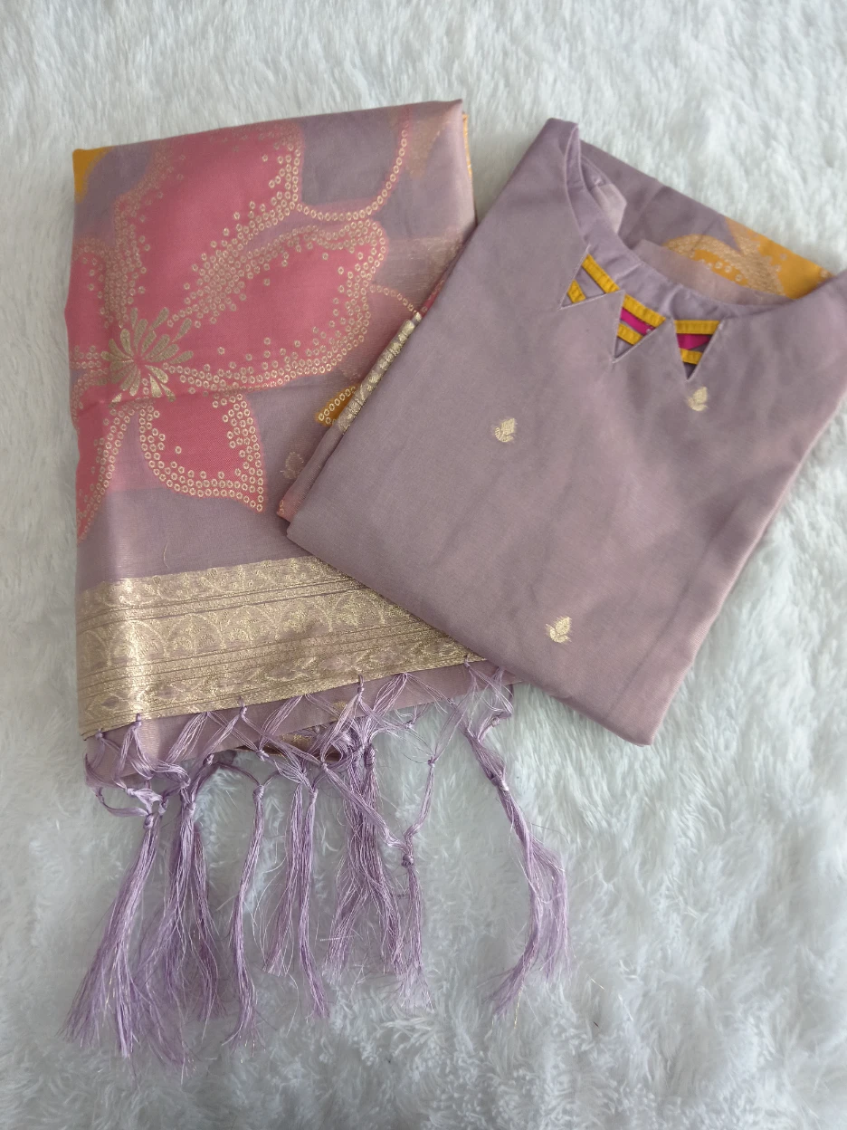 Upgrade your everyday style with the Lavender Yellow Top Shawl set, a graceful combination that blends soft elegance with subtle vibrance. Featuring a soothing lavender top paired with a beautifully designed yellow-toned shawl with floral patterns and zari borders, this set offers a refined and elegant look.