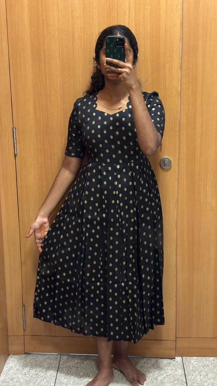 The dress comes with a neat round neckline and well-fitted sleeves, giving it a clean and polished look. The gathered waistline adds volume and creates a flattering flared shape that moves gracefully. With a comfortable 45-inch length, it provides a perfect balance between modesty and modern style.