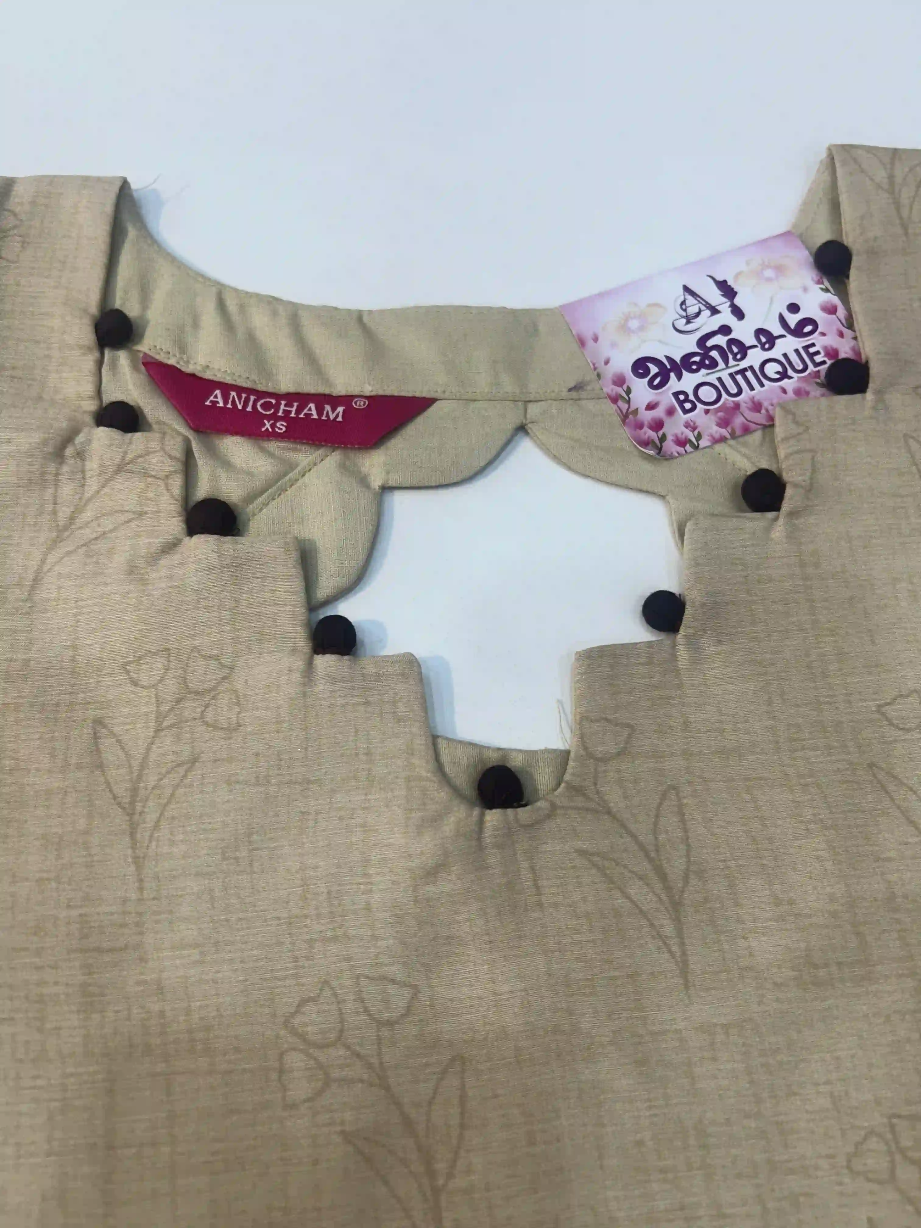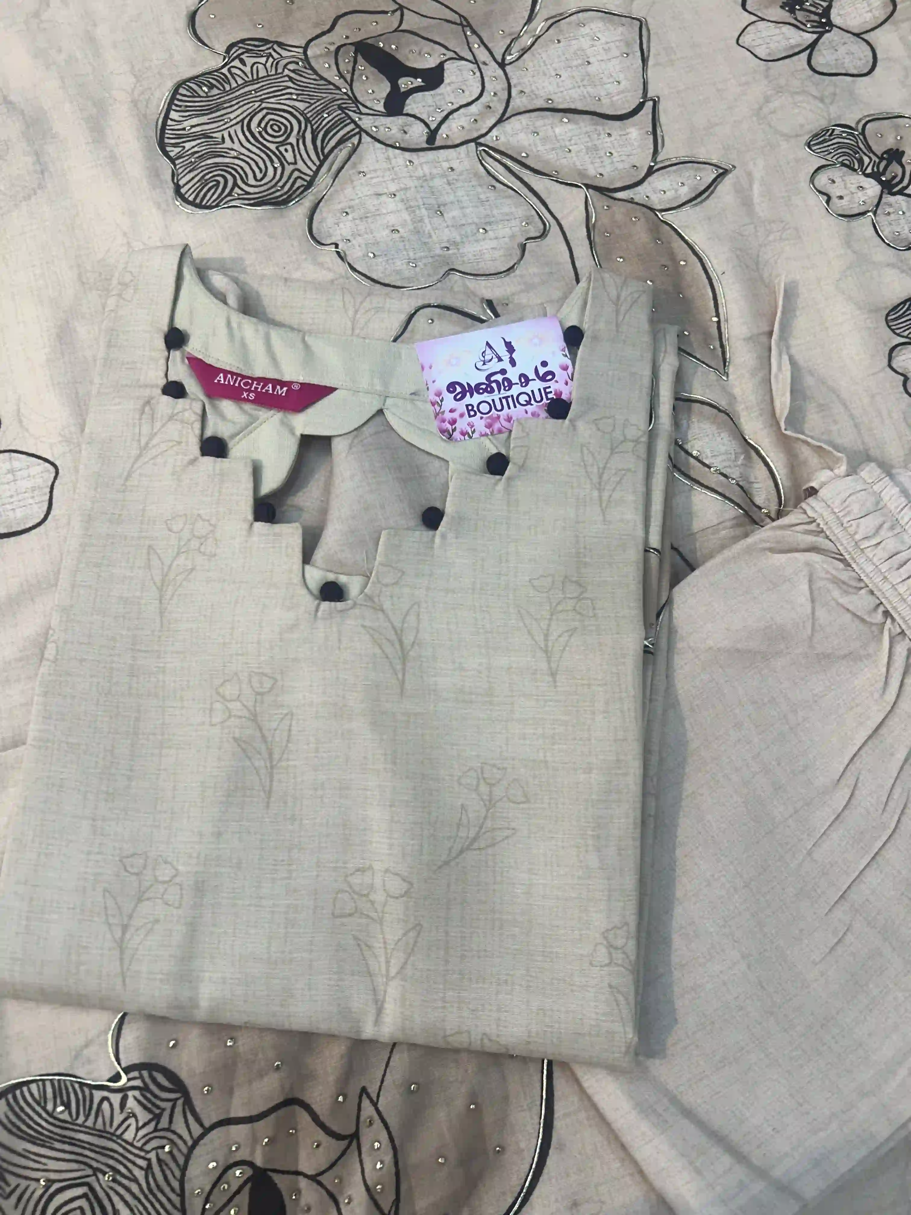 The top features a uniquely designed neckline accented with cute fabric button detailing, adding a refined and stylish element to the outfit. The soft floral motifs spread across the fabric give it a subtle elegance, while the clean tailoring ensures a neat and flattering silhouette.