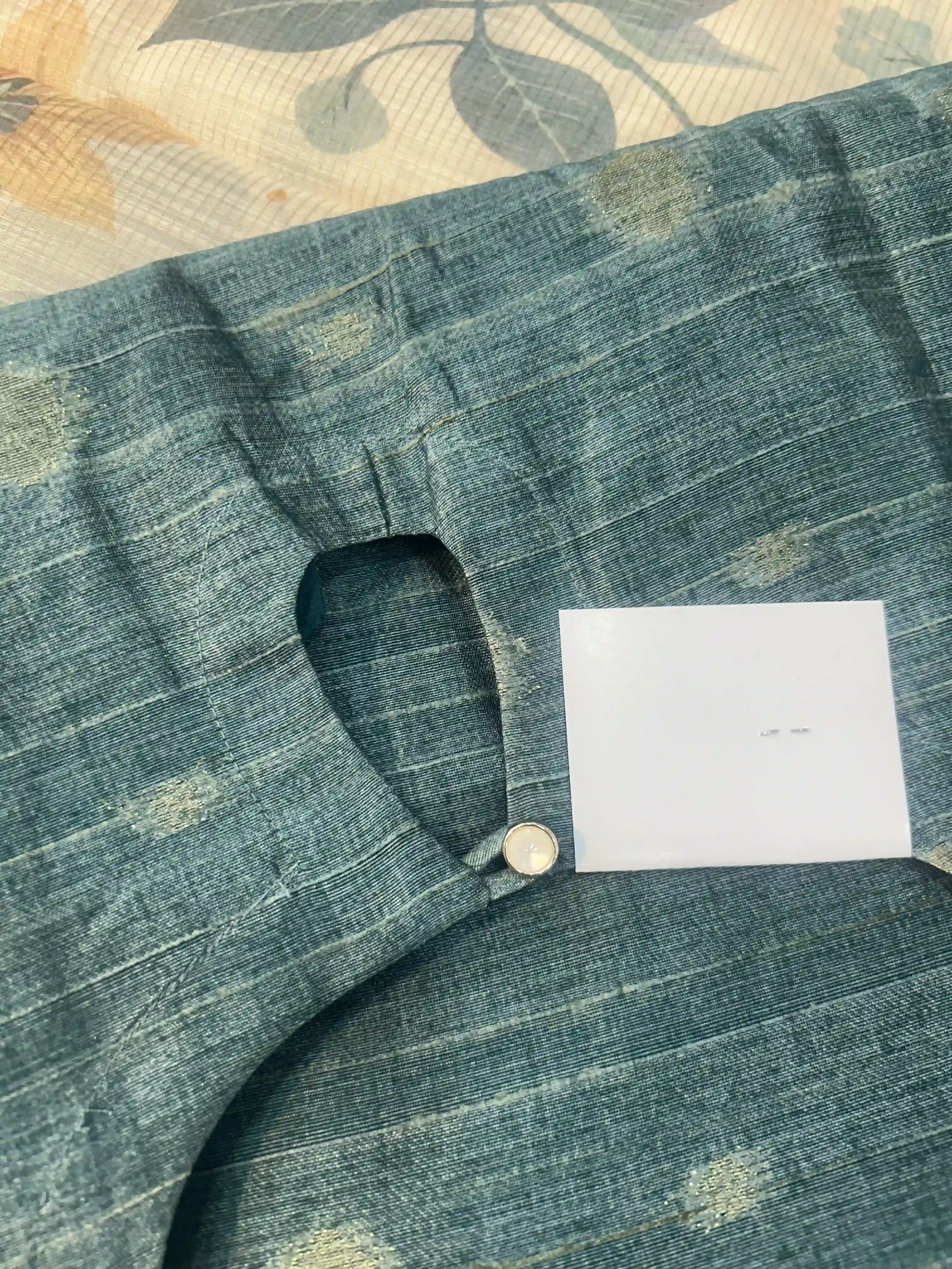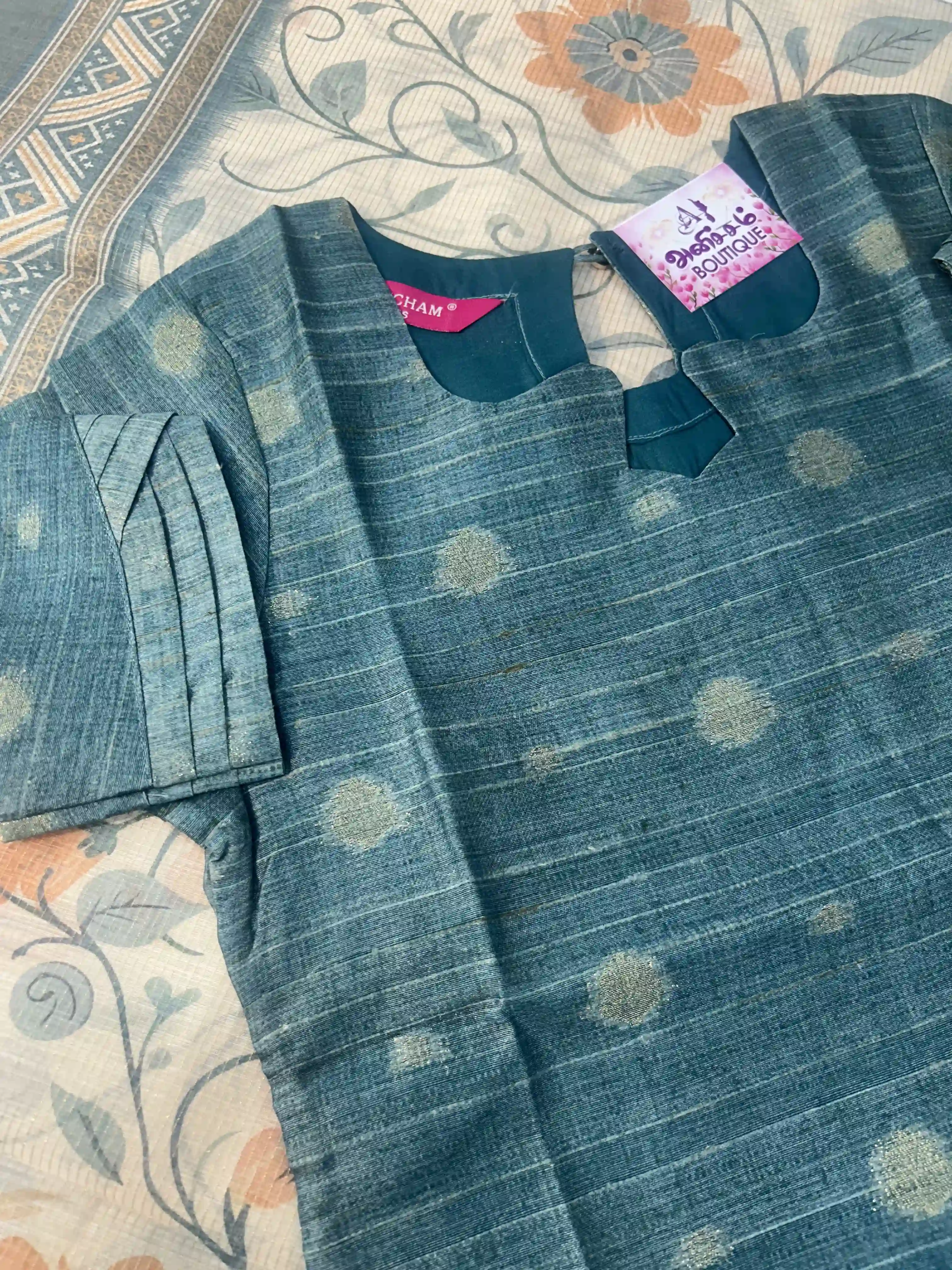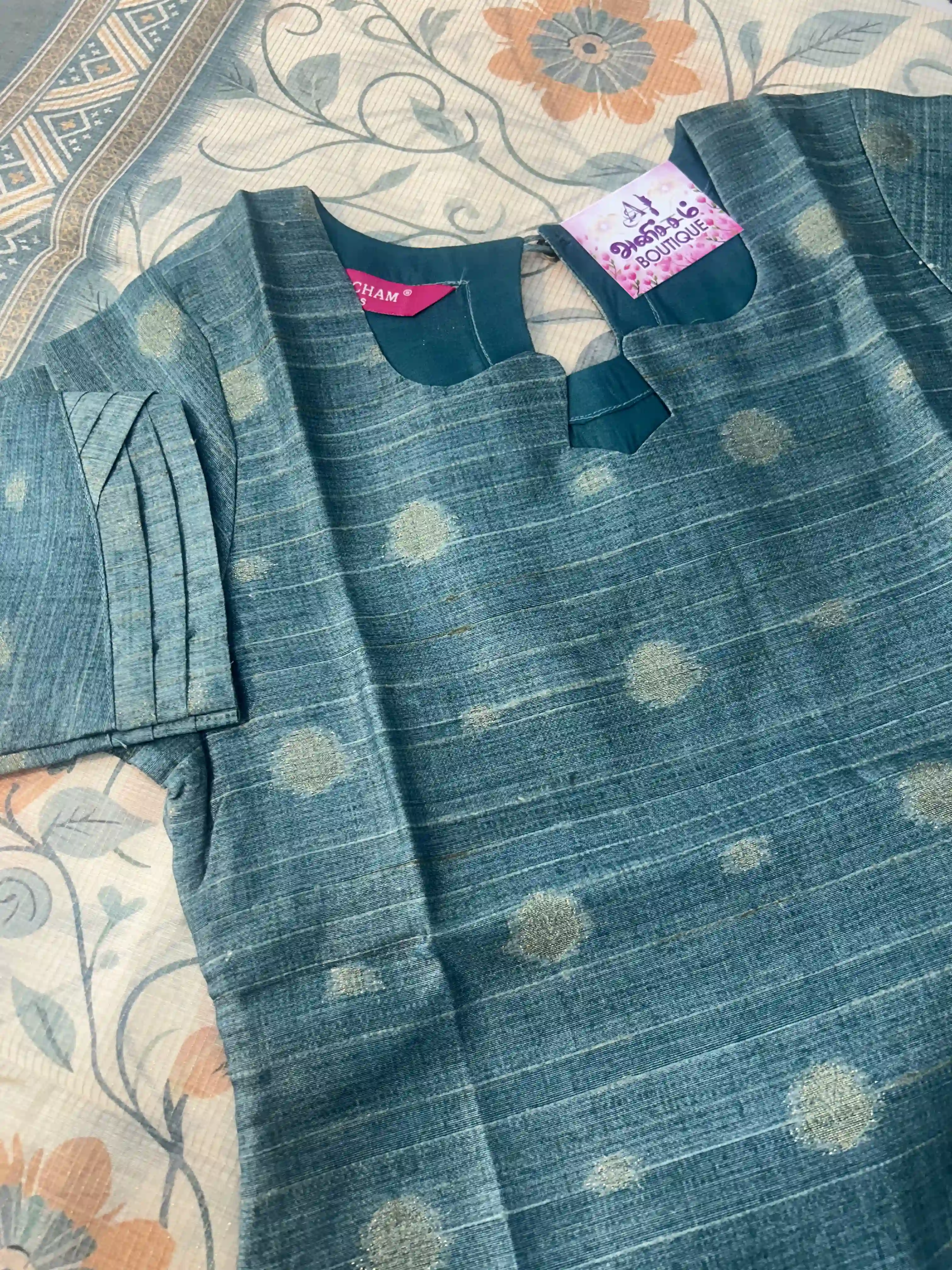The top is designed with a stylish neckline that adds a contemporary touch to the traditional design. The clean silhouette, along with neatly tailored sleeves featuring subtle pleat detailing, enhances the overall structure and gives it a polished finish. The minimal butti pattern keeps the look elegant and versatile.