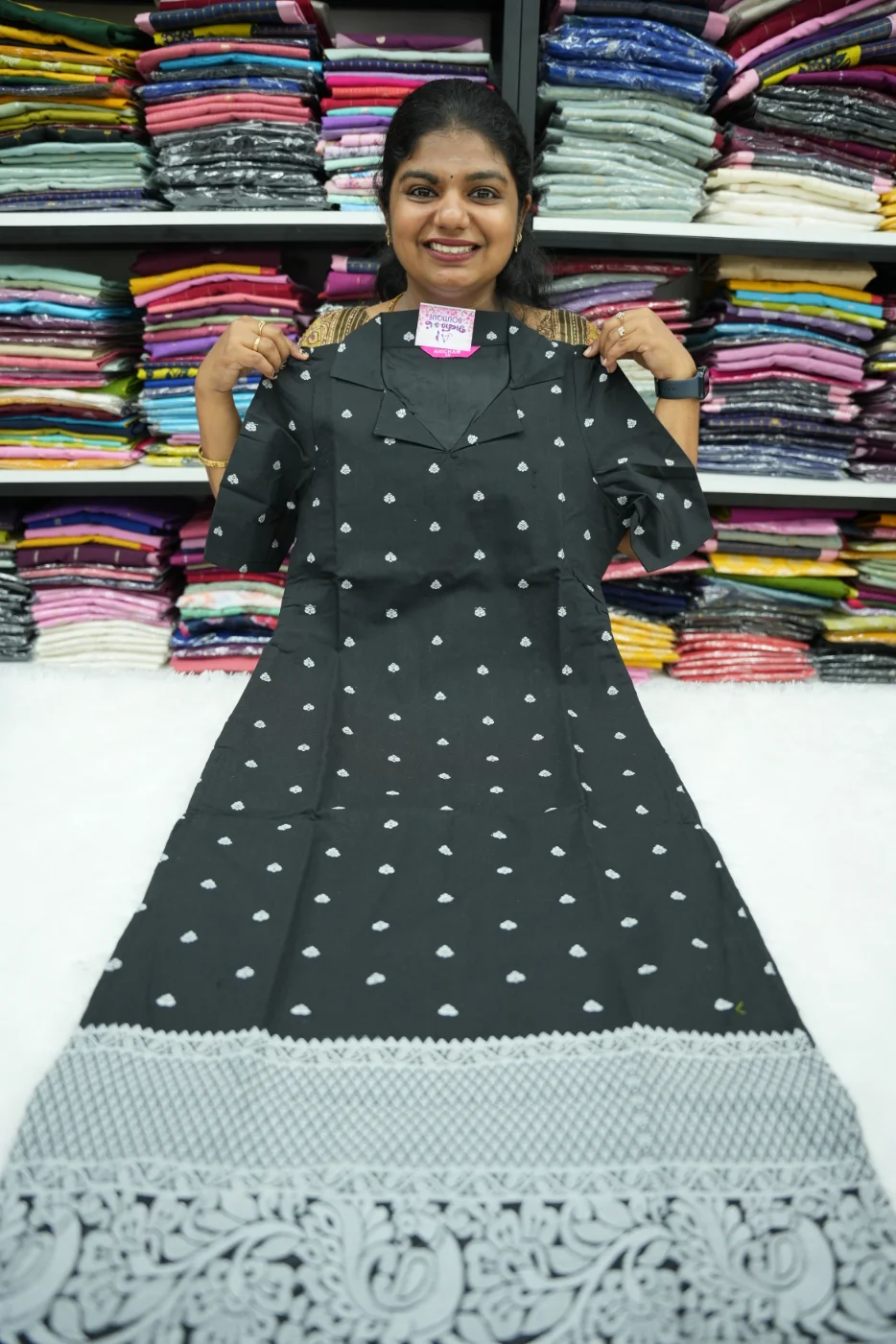 Black Top Exude bold confidence and modern ethnic charm with the Black Top set, a stunning ensemble that masterfully plays with high-contrast detailing. This outfit features a deep charcoal-black body adorned with prominent silver-white leaf-shaped butta motifs that add a regal, traditional touch to the contemporary silhouette. The design is beautifully defined by a sophisticated collar and a sharp V-cut neckline, providing a refined, artistic finish. Crafted from premium-quality, breathable textured fabric, this set is designed for the woman who loves to make a statement while enjoying all-day comfort.