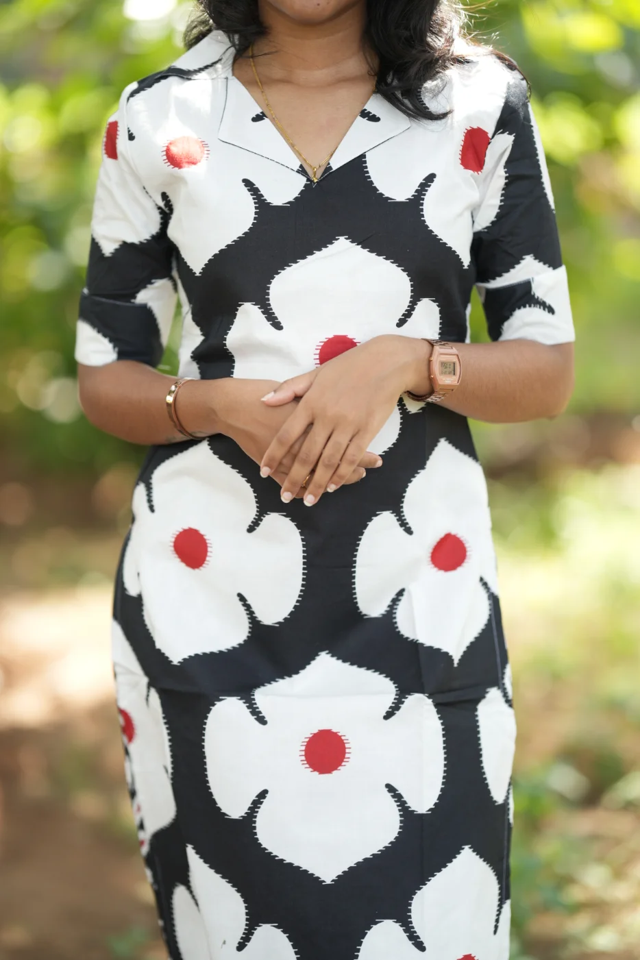 Eye-catching black and white floral print with vibrant red accents