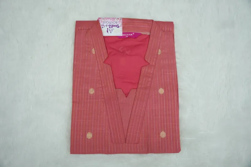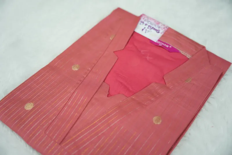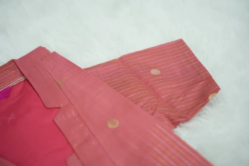 Carrot Peach Exude timeless elegance and soft feminine charm with the Carrot Peach set, a stunning ensemble that masterfully plays with delicate hues and refined patterns. This outfit features a warm carrot-peach colored body adorned with delicate, vertical golden stripes and shimmering circular butta motifs that add a regal touch to the traditional silhouette. The design is beautifully defined by a sophisticated high-neck collar and a unique, geometric-cut neckline that provide a sharp, artistic contrast. Crafted from premium-quality, breathable textured fabric, this set is designed for the woman who loves to make a statement while enjoying all-day comfort.