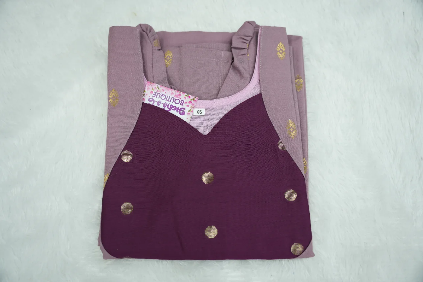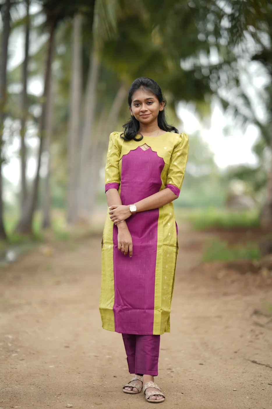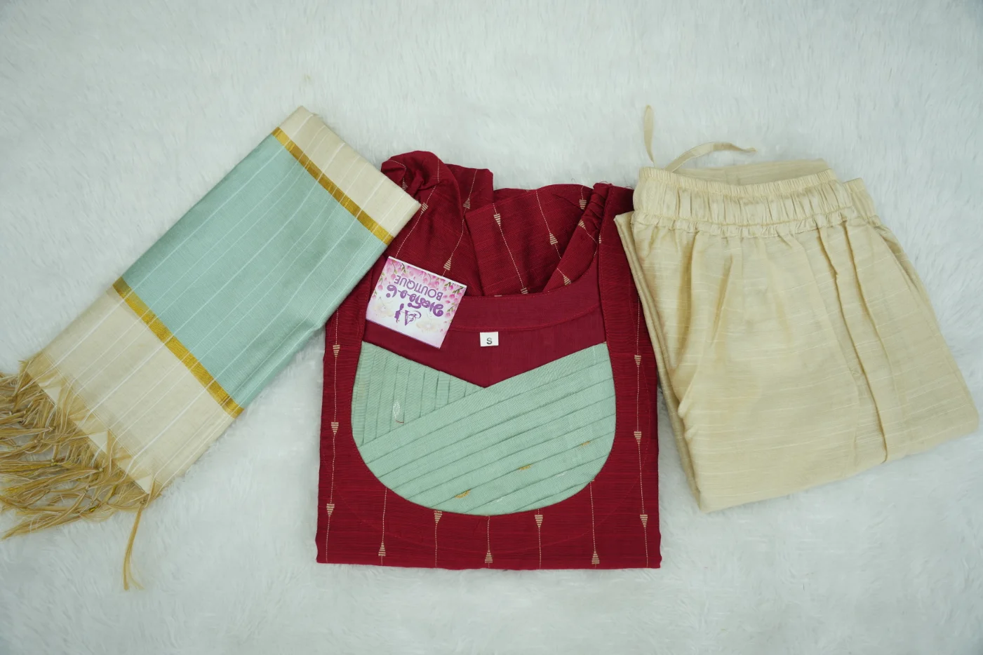 Cherry Pleated Arrow Exude timeless elegance and bold sophistication with the Cherry Pleated Arrow set, a stunning ensemble that masterfully plays with rich textures and refreshing color contrasts. This outfit features a deep cherry-red body adorned with delicate, vertical golden "arrow" motifs that add a regal, elongated touch to the traditional silhouette. The design is beautifully defined by a serene seafoam green yoke featuring a contemporary pleated, overlapping V-cut design that provides a sharp, artistic contrast. Crafted from premium-quality, breathable textured fabric, this set is designed for the woman who loves to make a statement while enjoying all-day comfort.