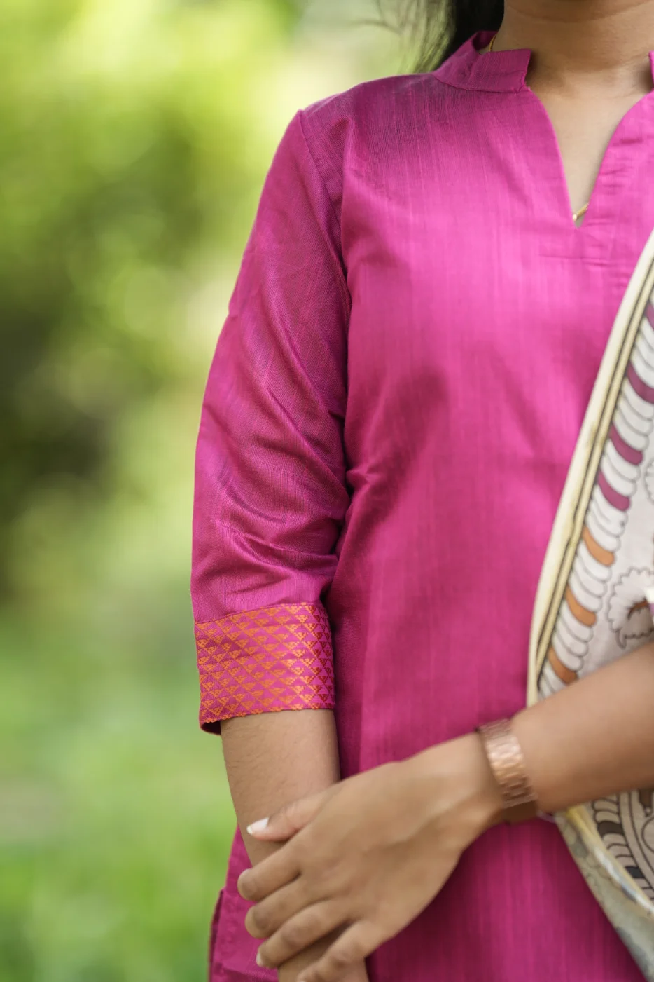 Step into a world of vibrant tradition and artistic flair with the Kanishka set. The deep, radiant magenta hue of the body serves as a bold statement of energy, while the premium-quality fabric with its subtle texture ensures a luxurious feel and a perfect fit. The highlight of this ensemble is the exquisite cream dupatta, adorned with intricate hand-painted style Kalamkari motifs that tell a story of heritage and grace. Ideal for festive occasions, weddings, or high-profile social gatherings, the Kanishka set combines rich color with timeless artistry effortlessly.