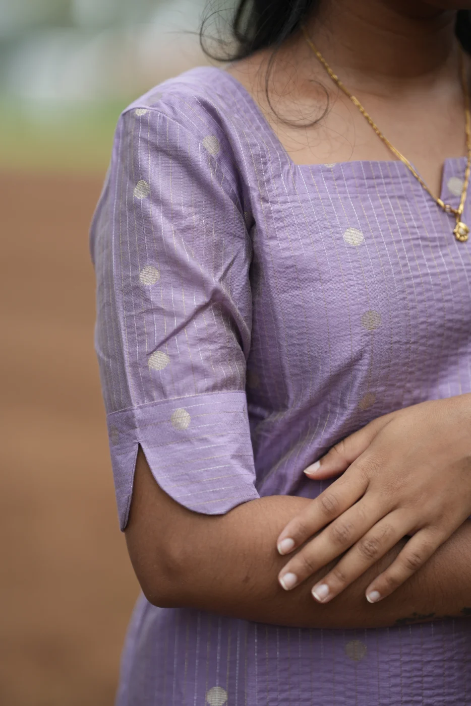 Exude a sense of calm sophistication with the Lilac Stripes set. The gentle lavender hue is beautifully accented by fine golden vertical stripes and shimmering polka motifs, creating a look that is both polished and serene. Crafted from premium-quality, textured fabric, this ensemble offers a soft touch and a breathable fit for all-day comfort. Ideal for daytime festivities, formal gatherings, or elegant social events, this dress combines modern detailing with a graceful, timeless charm effortlessly.