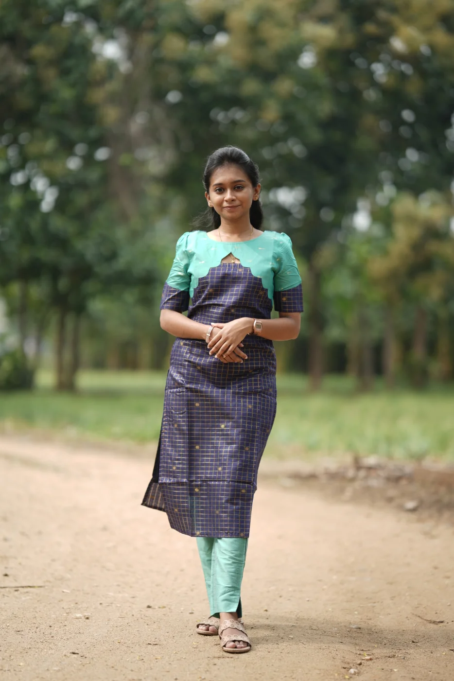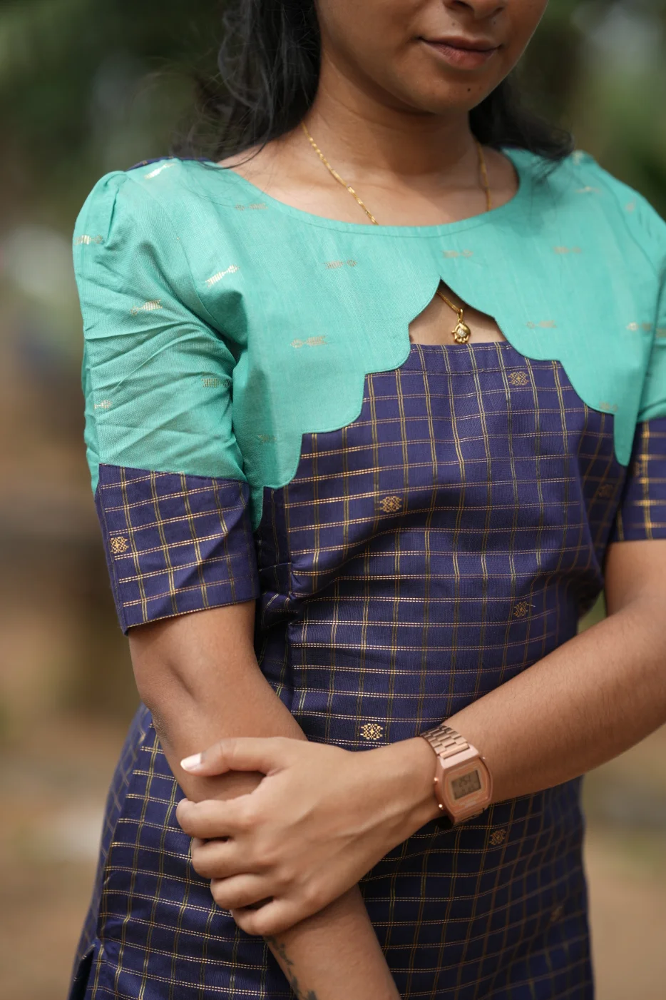 Command attention with the striking and sophisticated Navy Blue With Rexona set. This ensemble features a deep navy blue body detailed with classic golden grid patterns, creating a regal and structured look. The vibrant sea-foam green (Rexona) yoke and sleeve detailing provide a refreshing pop of color, while the unique scalloped neckline adds a touch of modern artistry. Crafted from premium-quality, textured fabric, this outfit offers a refined fit that is perfect for festive celebrations, formal gatherings, or elegant evening wear.