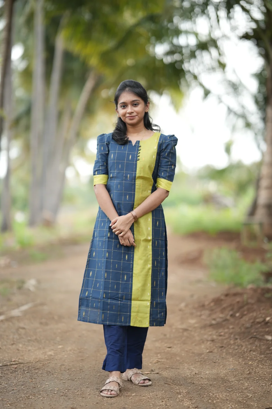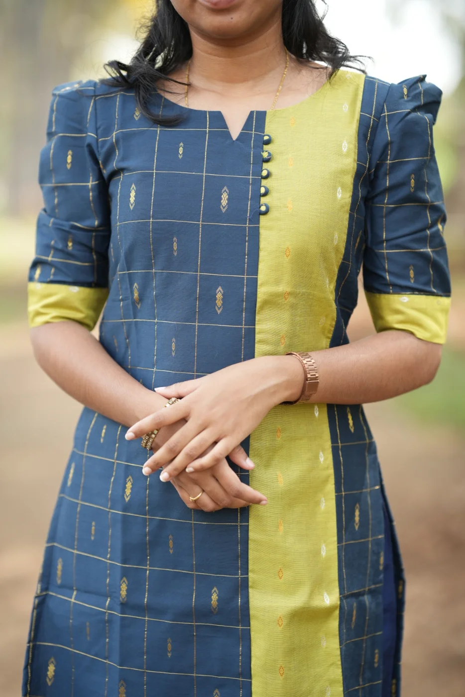 Command a regal presence with the Sindhu set, a masterclass in sophisticated color-blocking and structured elegance. This ensemble features a deep navy blue body adorned with a classic golden grid pattern and shimmering diamond micro-motifs. The striking lime-green center panel and sleeve cuffs provide a vibrant contrast, while the unique neckline—accented with delicate fabric buttons—adds a contemporary touch to the traditional silhouette. Crafted from premium-quality, breathable fabric with a rich texture, the Sindhu set is designed to offer a sharp, tailored fit that ensures you stand out at any festive occasion or high-profile social gathering.
