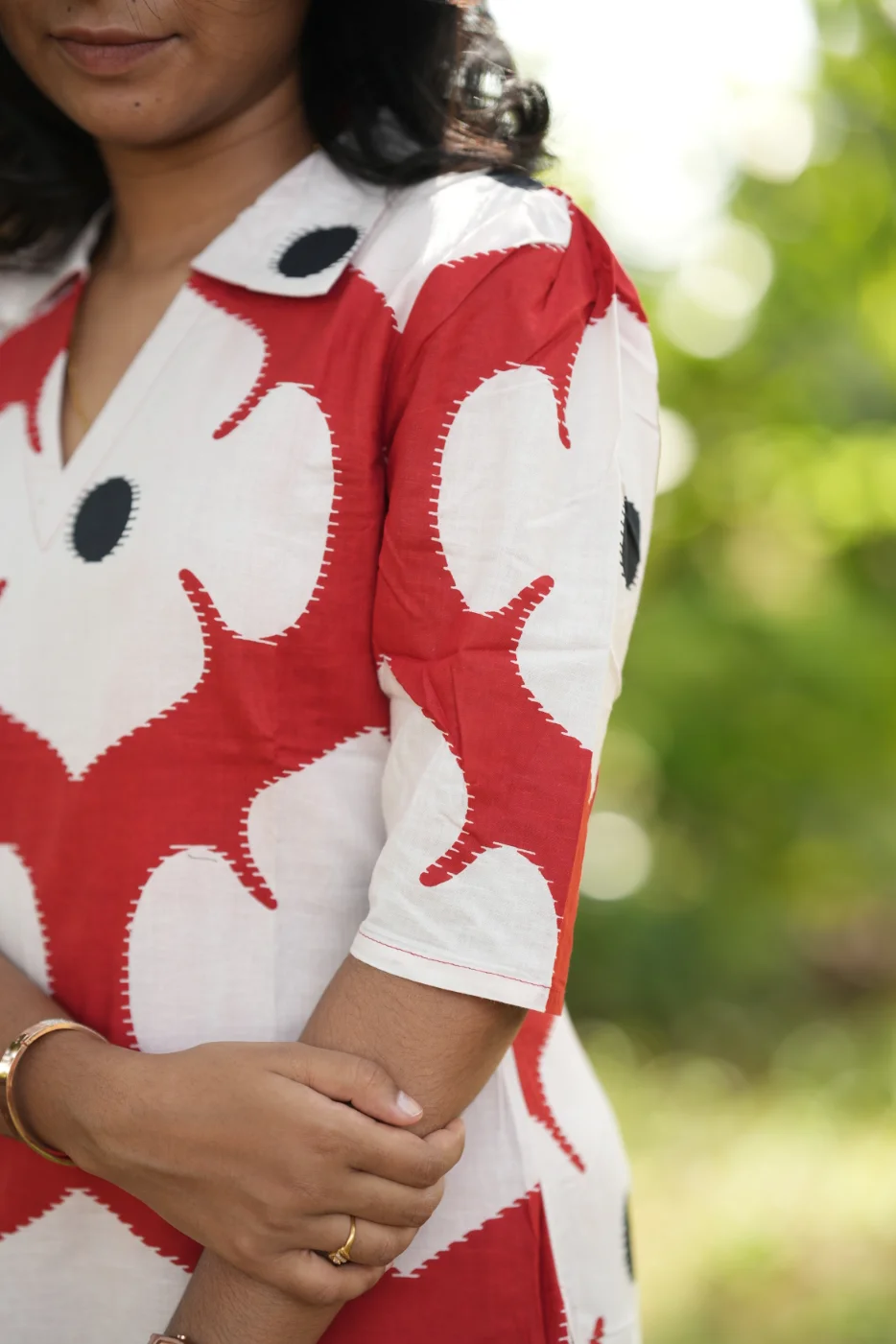 Make a bold and artistic statement with the Sindoor Co-ords set. Featuring an eye-catching, large-scale floral print in a striking red and white palette, this ensemble is designed for the modern woman who loves contemporary style with a traditional soul. The top is thoughtfully tailored with a sophisticated collar and V-neckline, while the matching trousers feature an intricate geometric pattern that creates a stylish visual contrast. Crafted from high-quality, breathable fabric, this co-ord set offers a relaxed yet sharp silhouette, making it the perfect choice for creative workspaces, daytime social events, or stylish weekend outings.