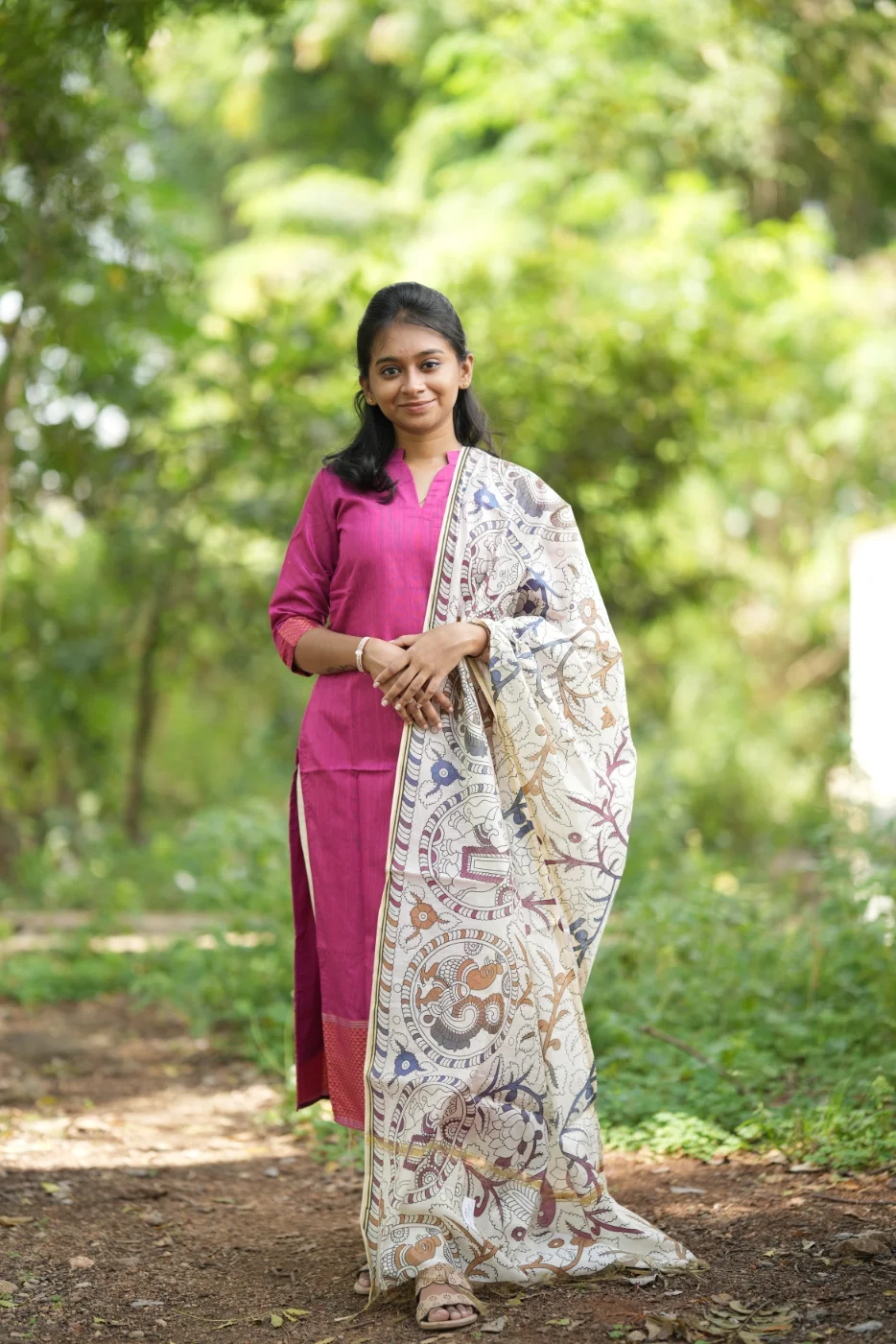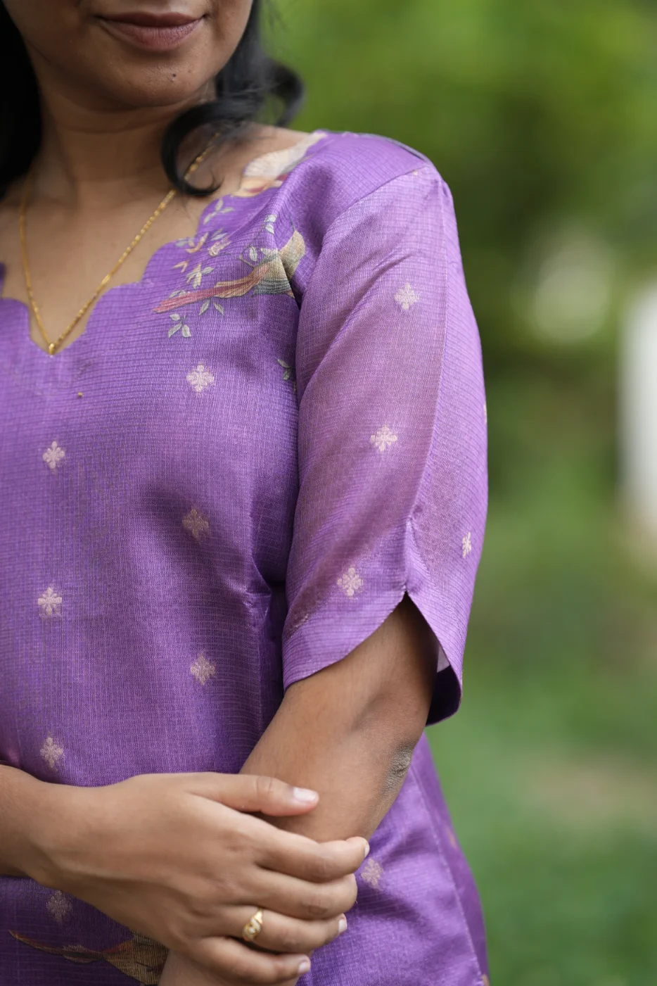 Experience the perfect harmony of nature and elegance with the Violet Garden set. This captivating ensemble features a rich violet body detailed with delicate shimmering micro-motifs. The design is artfully elevated by an exquisite botanical print at the hemline, featuring vibrant peacocks and lush floral landscapes. Crafted from premium-quality, breathable textured fabric, this outfit offers a soft, structured silhouette that ensures all-day comfort. The contemporary scalloped neckline and unique slit sleeves add a modern touch to its traditional grace, making it an ideal choice for festive celebrations, cultural ceremonies, or elegant daytime events.