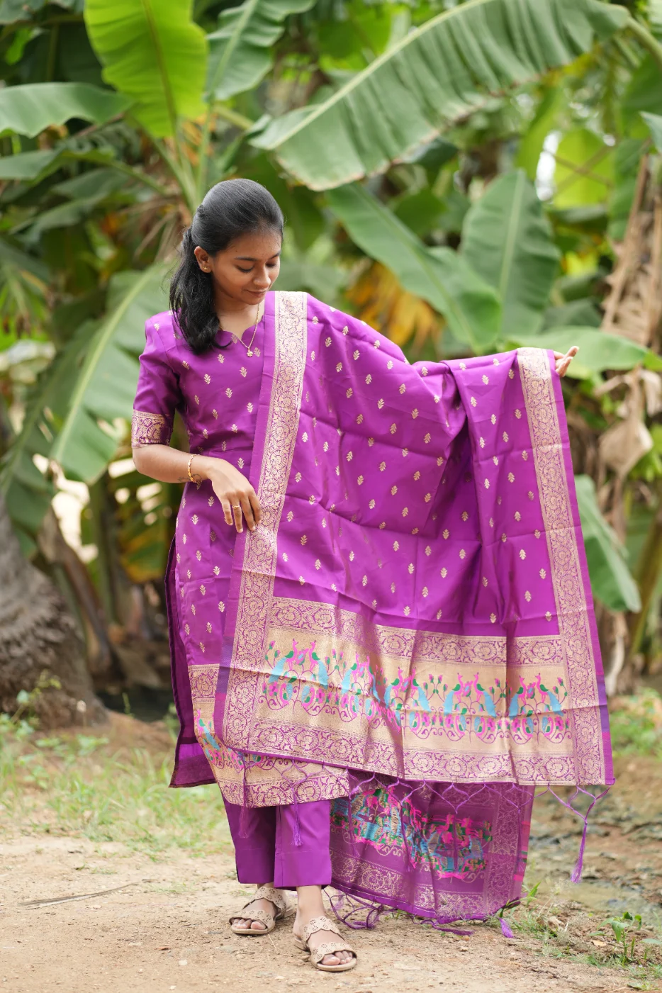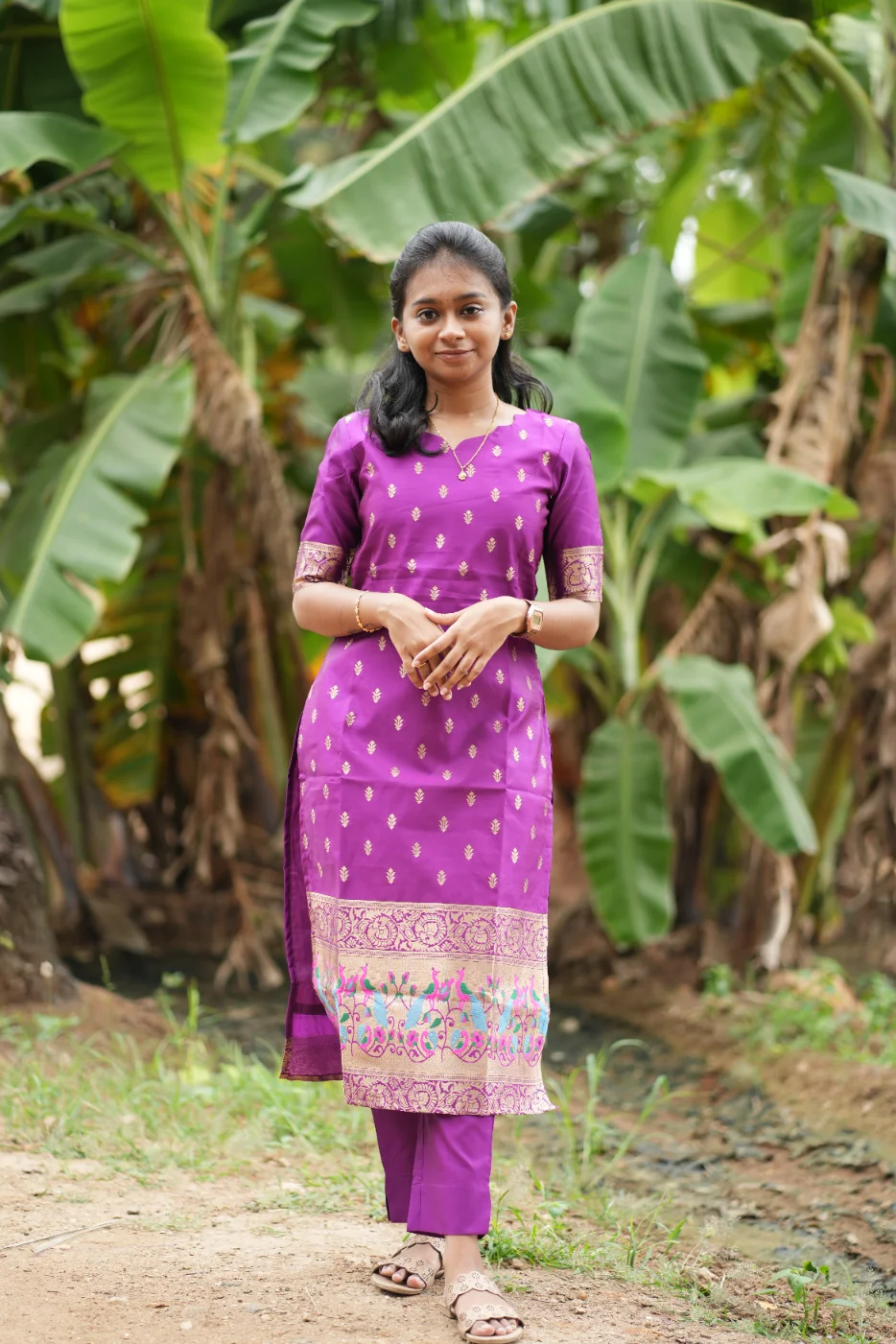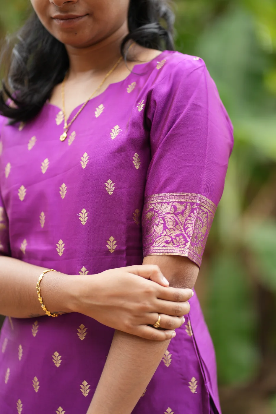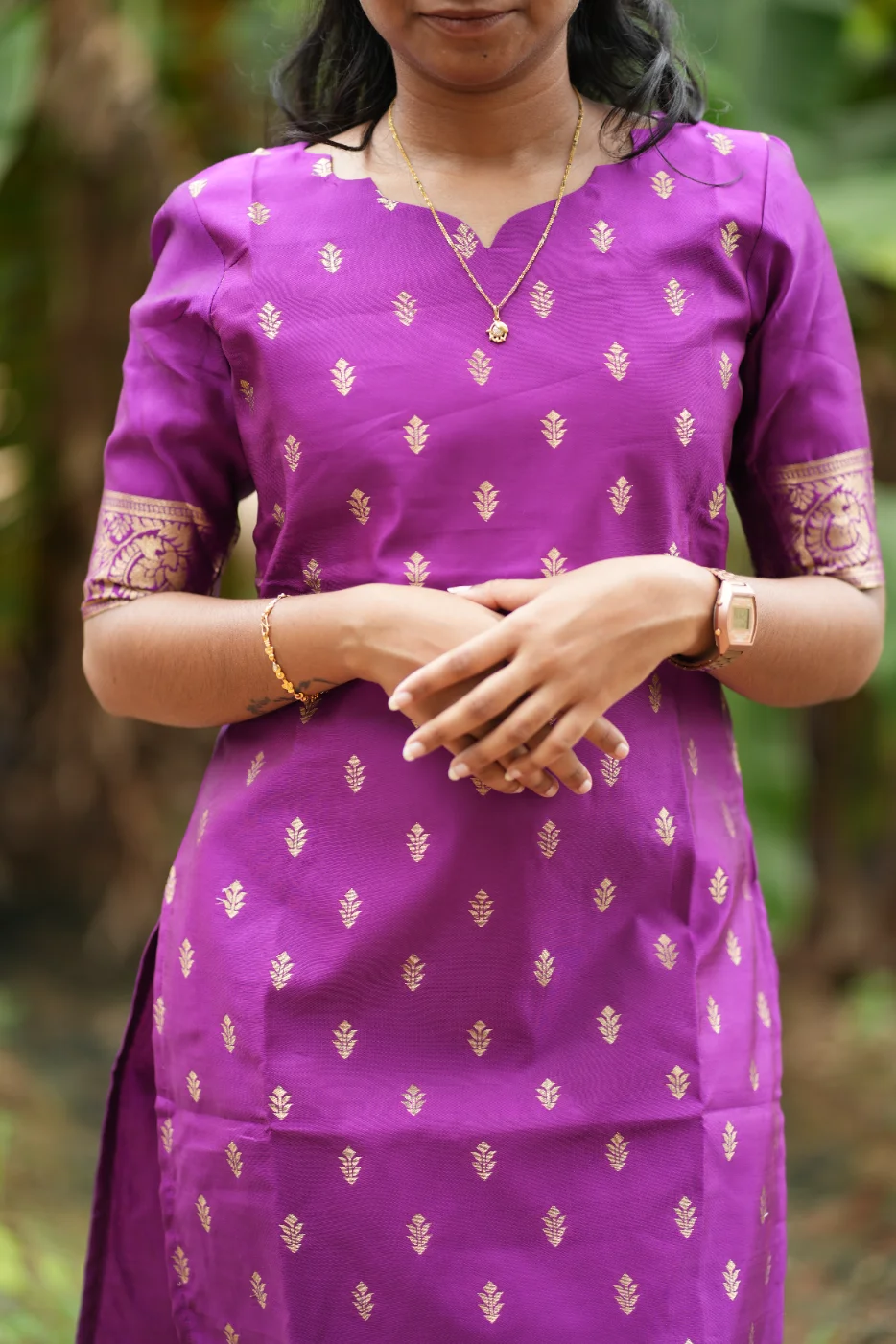 Product Description: Exude royal charm with the Vindhya Purple Set, a luxurious three-piece ensemble designed for festive elegance. This stunning kurti is crafted from a rich silk-blend fabric in a deep, vibrant purple hue, intricately dotted with delicate gold zari motifs (buttas) that shimmer with every movement.