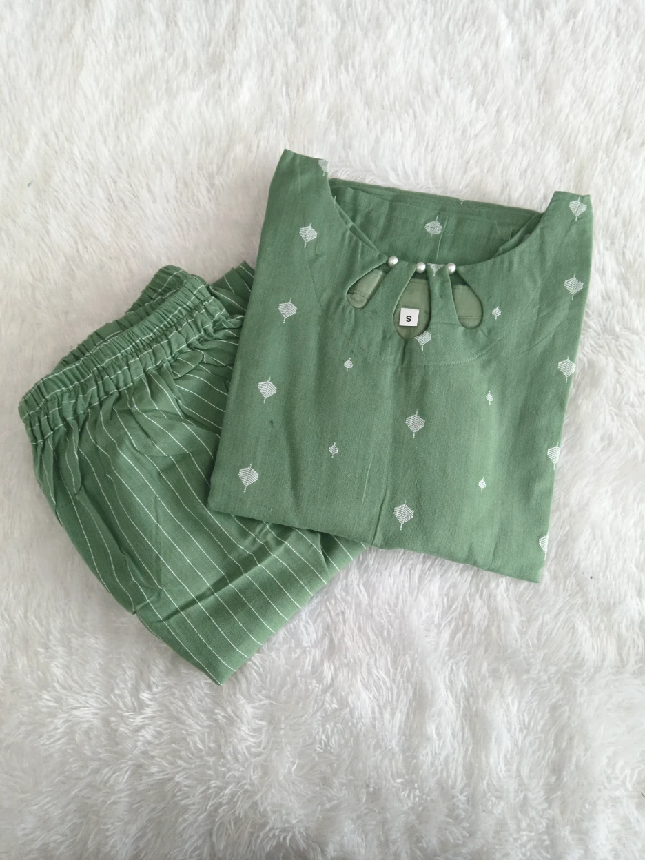 Crafted from breathable and lightweight fabric, the Pista Green Co-ord offers a relaxed yet flattering fit, perfect for all-day wear. The top is enhanced with a delicate neckline design featuring pearl detailing, while the striped bottom adds a stylish contrast, completing the coordinated look.