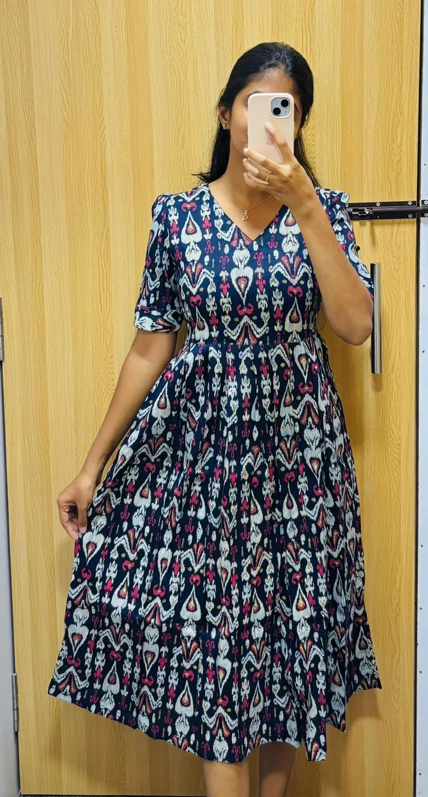 Crafted from soft and breathable fabric, it features a flattering V-neckline, neatly tailored bodice, and a flowy flared silhouette that enhances your natural shape. The elbow sleeves add a modest and stylish touch, making it perfect for daily wear, casual outings, or small gatherings.