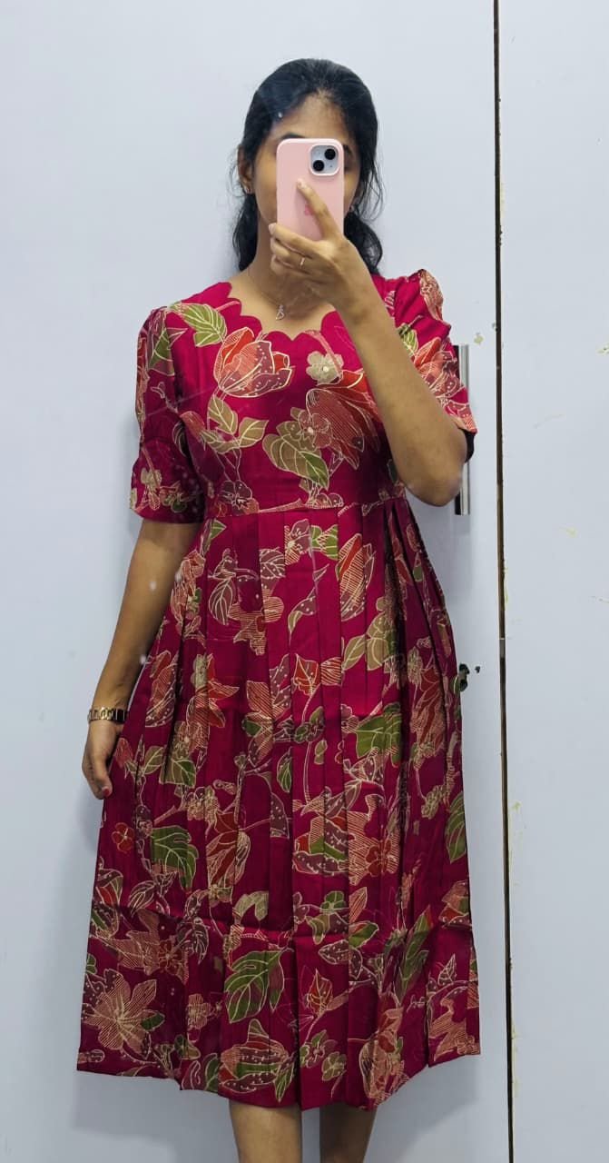 The dress is styled with a neat round neckline and well-structured sleeves, adding a touch of simplicity and elegance. The gathered waistline creates a graceful flare, offering a relaxed yet stylish fit that moves effortlessly. With a comfortable 45-inch length, it provides a perfect balance of modesty and modern appeal.