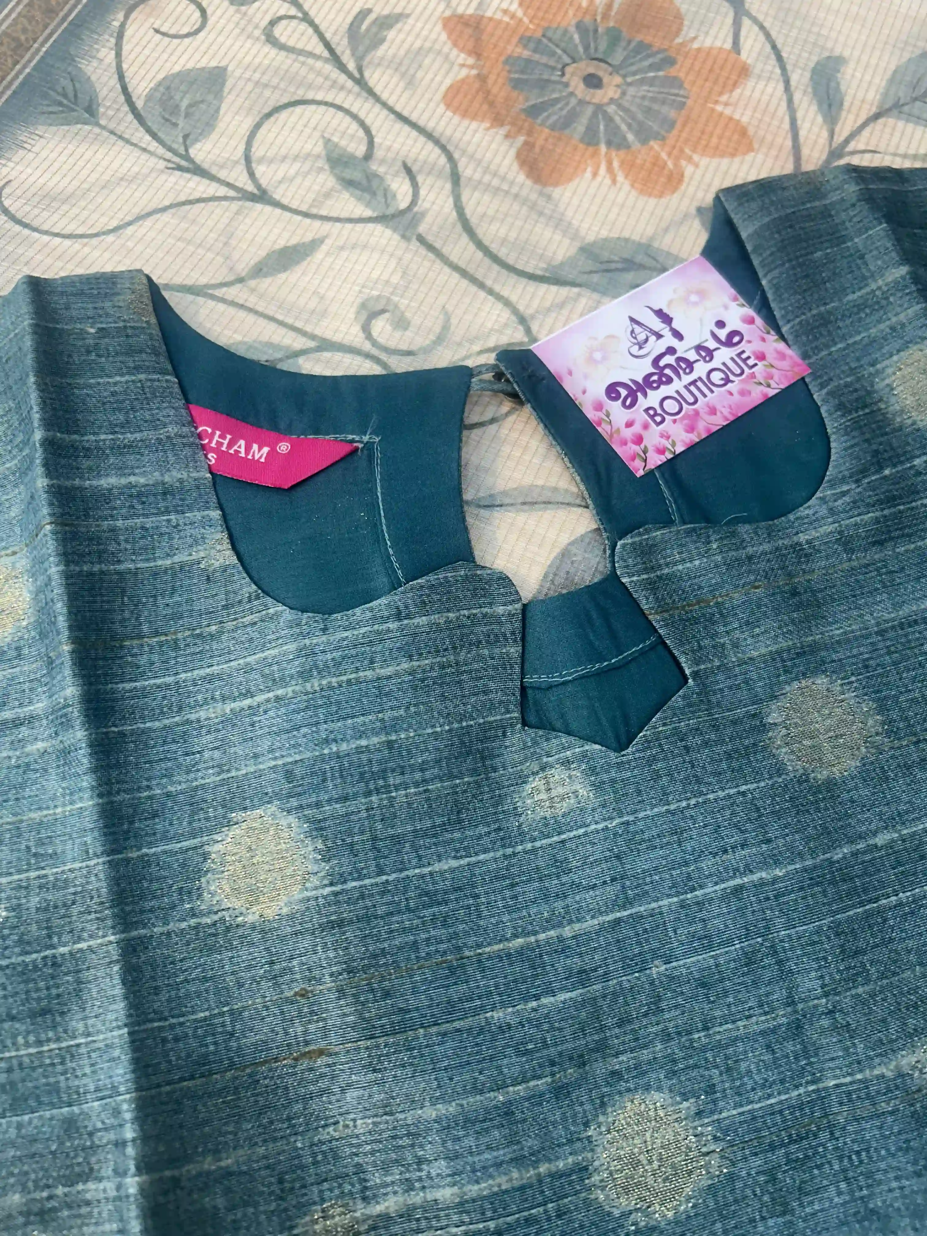 The top is designed with a stylish neckline that adds a contemporary touch to the traditional design. The clean silhouette, along with neatly tailored sleeves featuring subtle pleat detailing, enhances the overall structure and gives it a polished finish. The minimal butti pattern keeps the look elegant and versatile.